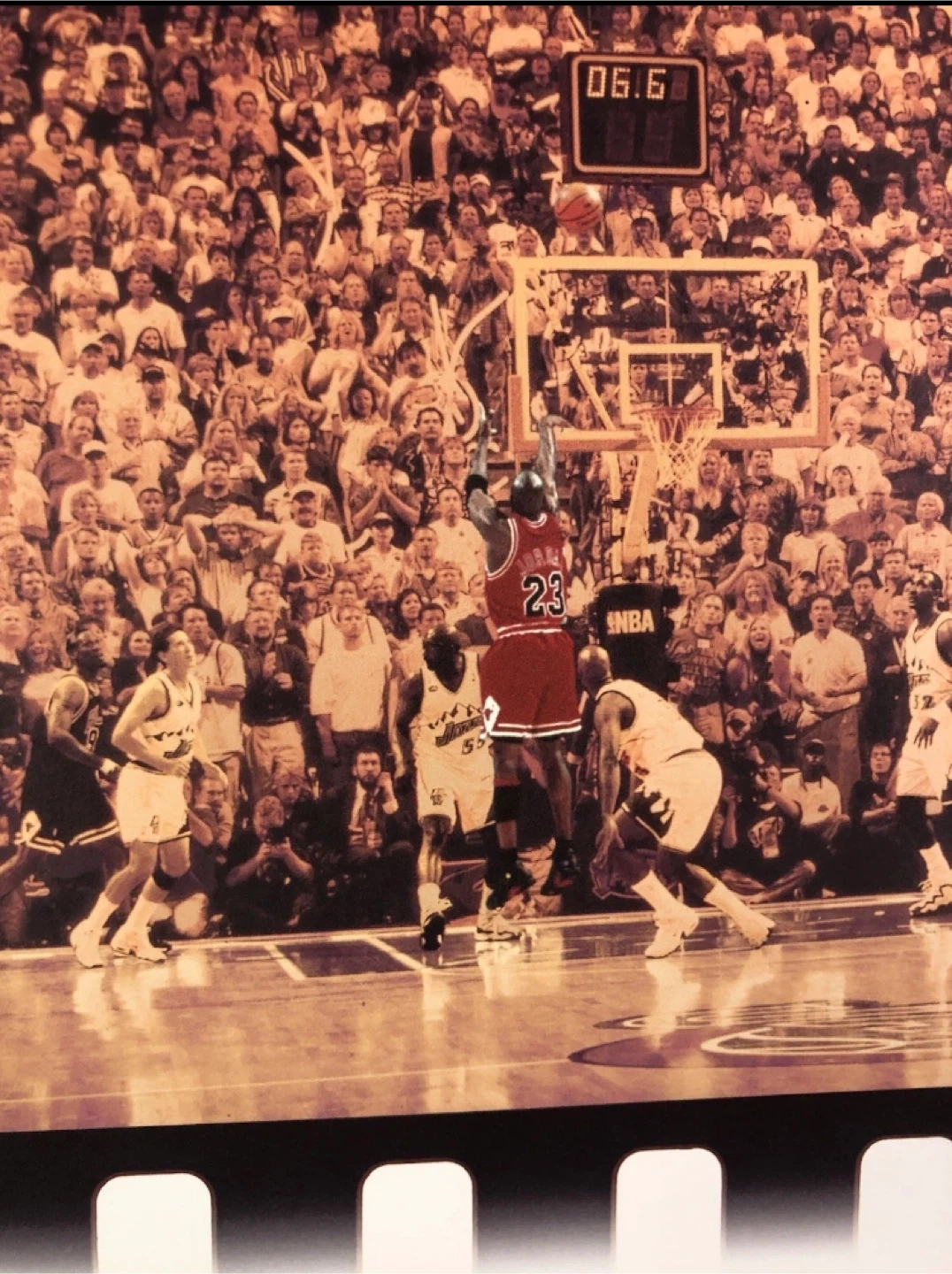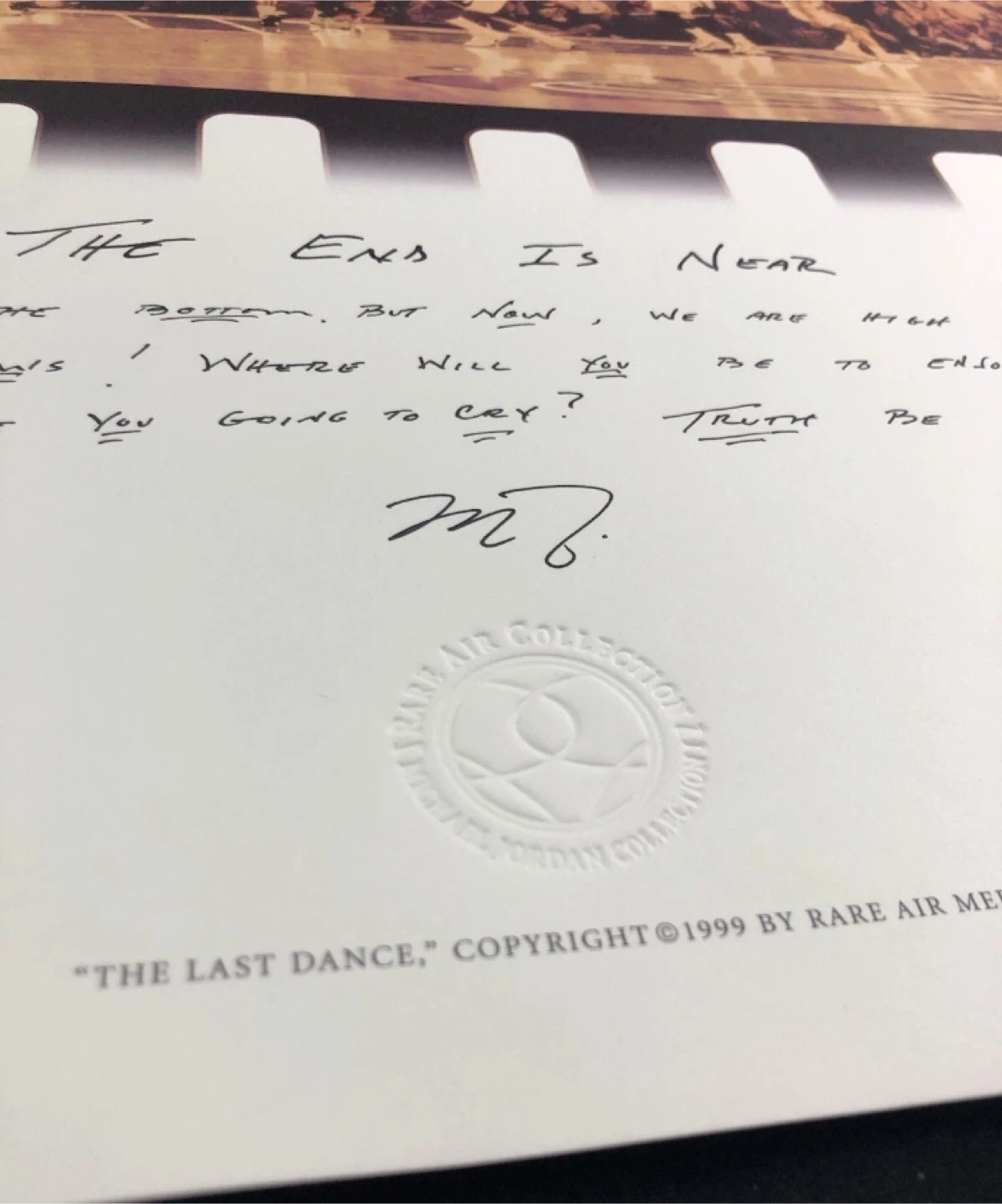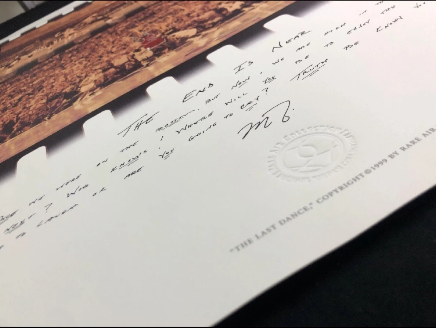This 19in x 28in lithograph print captures Michael Jordan's iconic "The Last Dance." Copyrighted 1999 by Rare Air Media. It features a handwritten quote "The End Is Near." "The Last Dance," copyright 1999 by Rare Air Media.