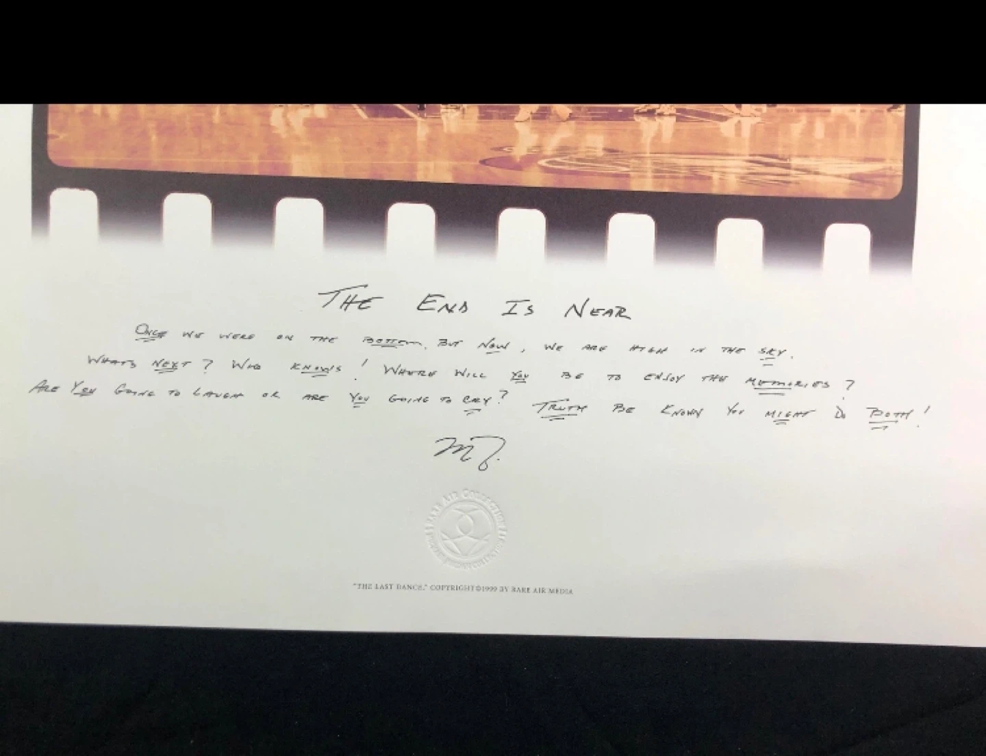 This 19in x 28in lithograph print captures Michael Jordan's iconic "The Last Dance." Copyrighted 1999 by Rare Air Media. It features a handwritten quote "The End Is Near." "The Last Dance," copyright 1999 by Rare Air Media.