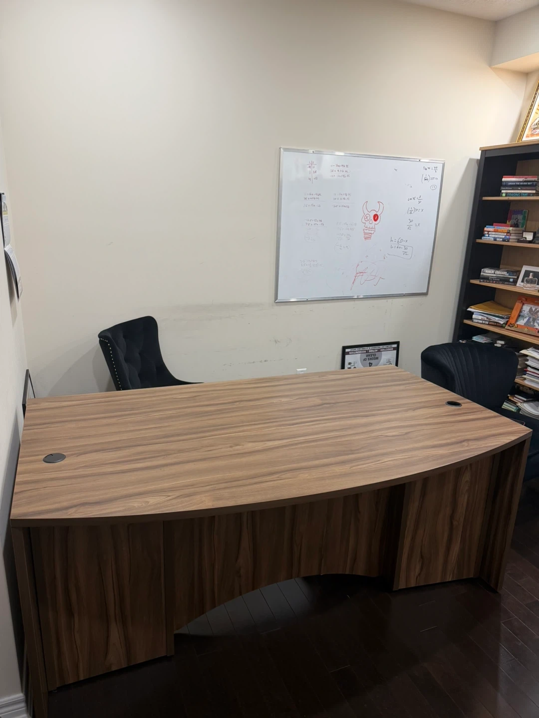 This executive desk has a warm wood finish and a modern curved design. It features two built-in drawers for storage and cable management holes. It's suitable for any home office or professional workspace.