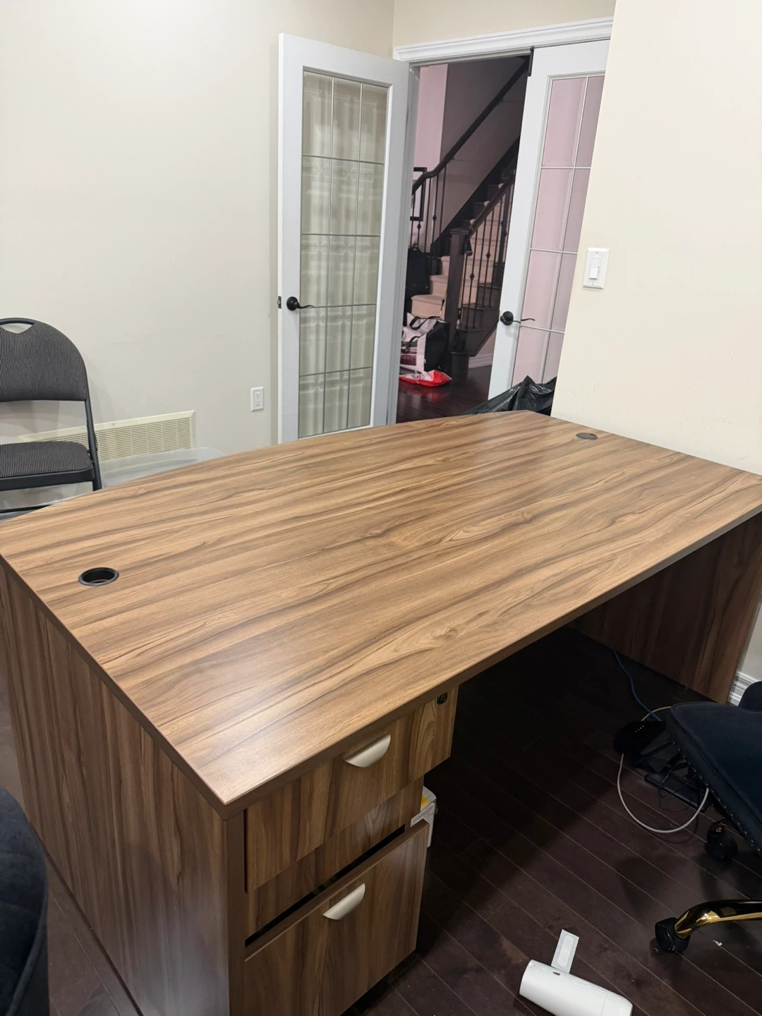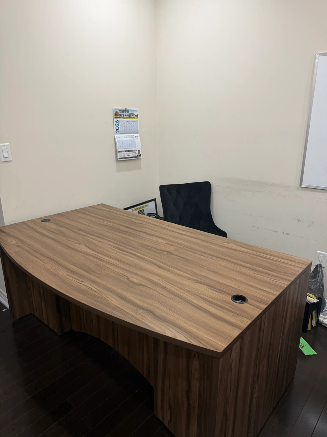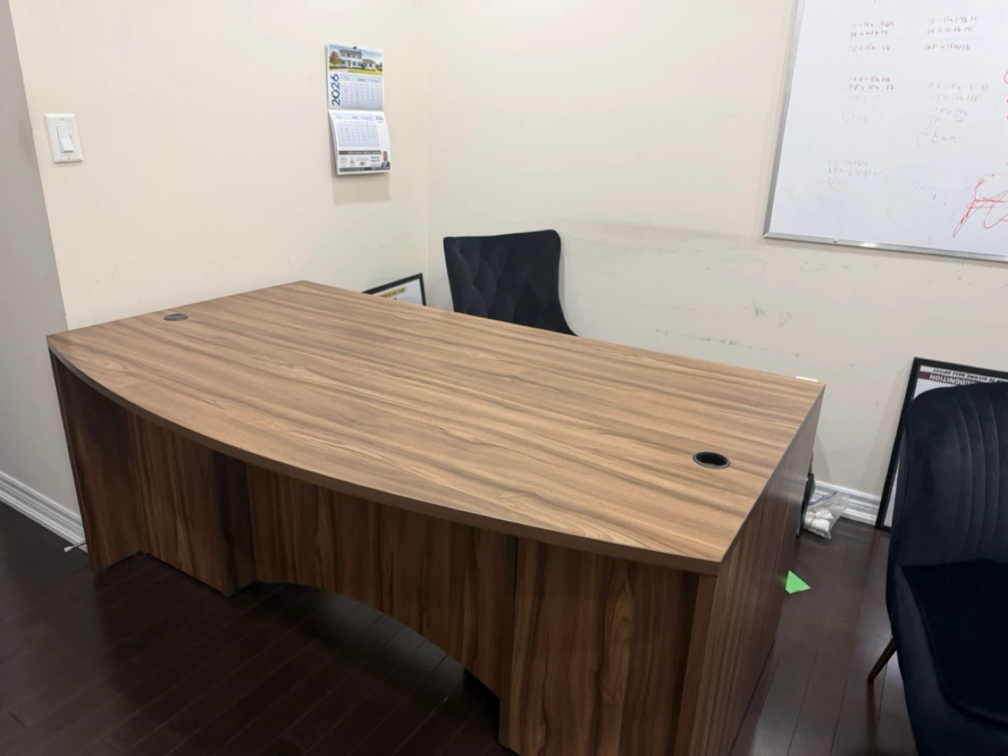 This executive desk has a warm wood finish and a modern curved design. It features two built-in drawers for storage and cable management holes. It's suitable for any home office or professional workspace.