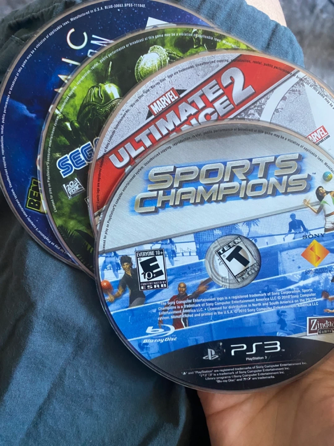 four PlayStation 3 games. Marvel Ultimate Alliance 2, Sports Champions, Ben 10 Ultimate Alien: Cosmic Destruction, and Aliens vs. Predator.