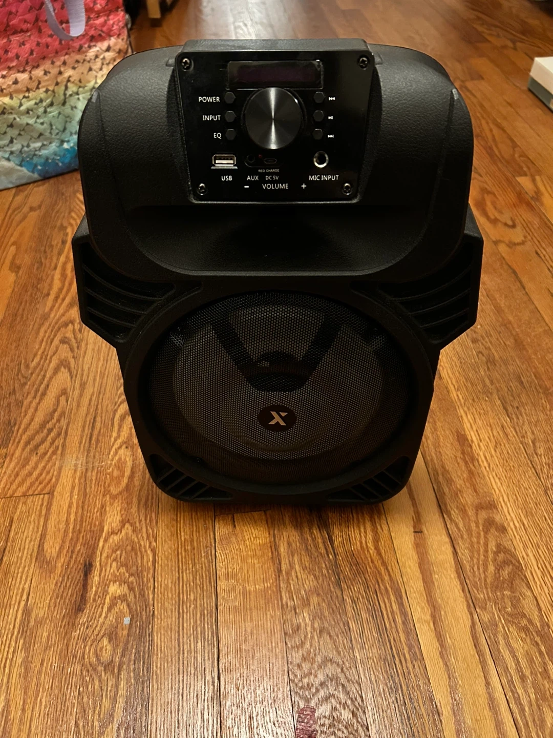 This Atalax portable thumper speaker comes in black. It's great for big parties or personal listening. It includes inputs for USB, AUX, and a microphone.