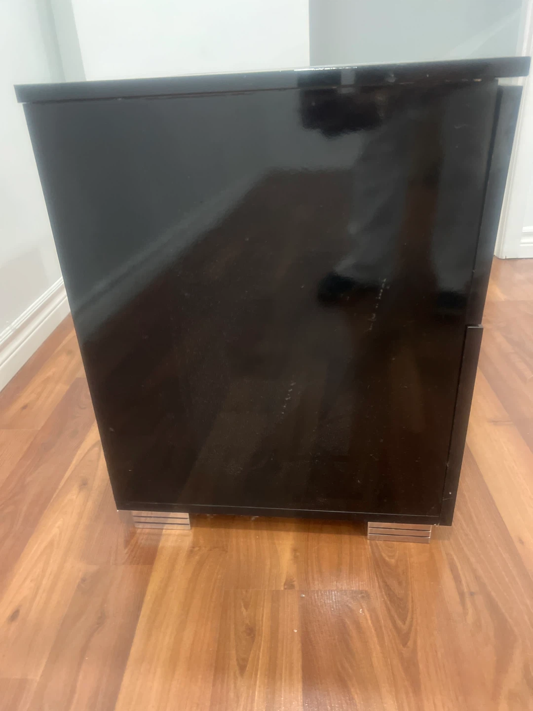 Selling a black nightstand with two drawers. It has a sleek, modern look with silver drawer pulls. Perfect for adding some storage and style to your bedroom!