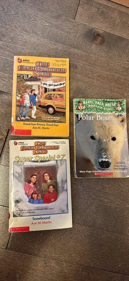 Fun book lot for sale! Includes 'Good-bye Stacey, Good-bye' and 'Super Special #7 Snowbound' from The Baby-sitters Club by Ann M. Martin. Also features 'Polar Bears and the Arctic' from Magic Tree House Research Guide by Mary Pope Osborne and Natalie Pope Boyce. All three books are Scholastic Apple Paperbacks.