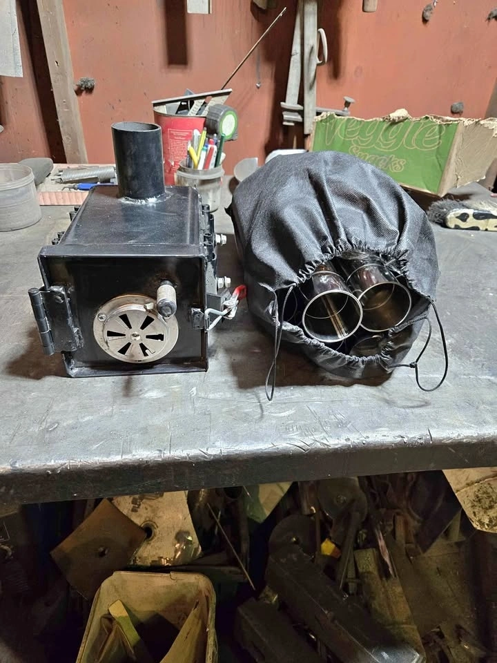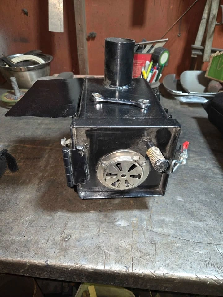 Looking for a reliable, ultra-portable heat source for your hot tent, ice shack, or workshop? This custom 6x6x8 inch stove is built for efficiency and ease of transport. Key Features & Specs: Compact 6" x 6" x 8" firebox—perfect for small spaces. Comes with a custom wrench to easily adjust height and level the stove on uneven terrain. Includes a detachable warming tray (perfect for coffee or keeping food warm) and a spring for stay-cool door handle. Complete stainless steel flue system including multiple interlocking pipe sections, a 90° adjustable elbow for versatile venting, an integrated damper for precise airflow and burn-rate control, and a spark arrestor section for safety. Silicone Roof Flashing (Stove Jack) included for easy tent installation. Freshly coated in high-heat resistant black paint. Everything packs down neatly into the included heavy-duty carry bag. Excellent, custom-built condition. Paint is fresh and drying. Ready for its first burn!
