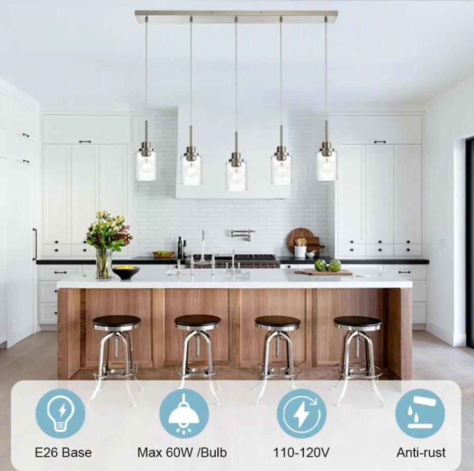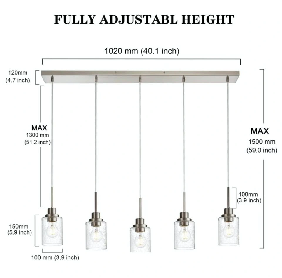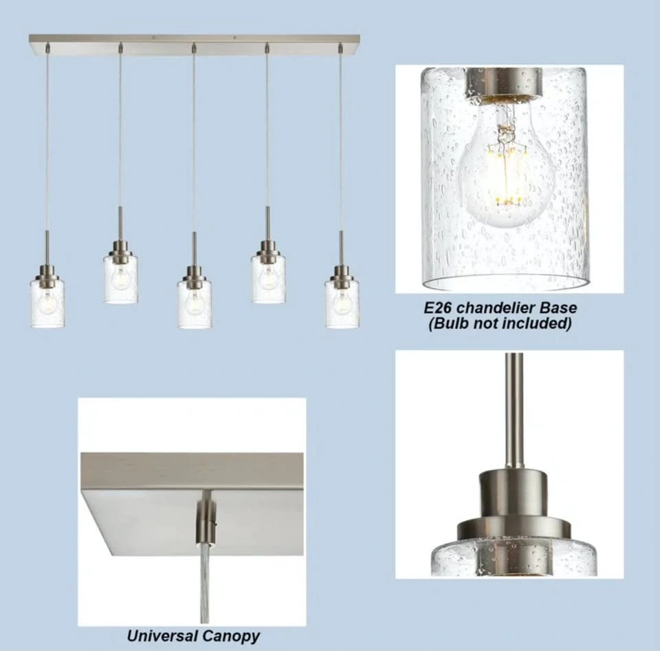 5 Light Kitchen Island Chandelier, Modern Pendant Light, Ceiling Lighting Metal Fixture with Seeded Glass Shade for Kitchen Island or Dining Room. Colour Brushed Nickel. Bought it from Wayfair for $379.99 and didn't end up using them. Brand New in box. Full adjustable hight. Fully dimmable when used with dimmable bulbs and compatible dimmer switch.