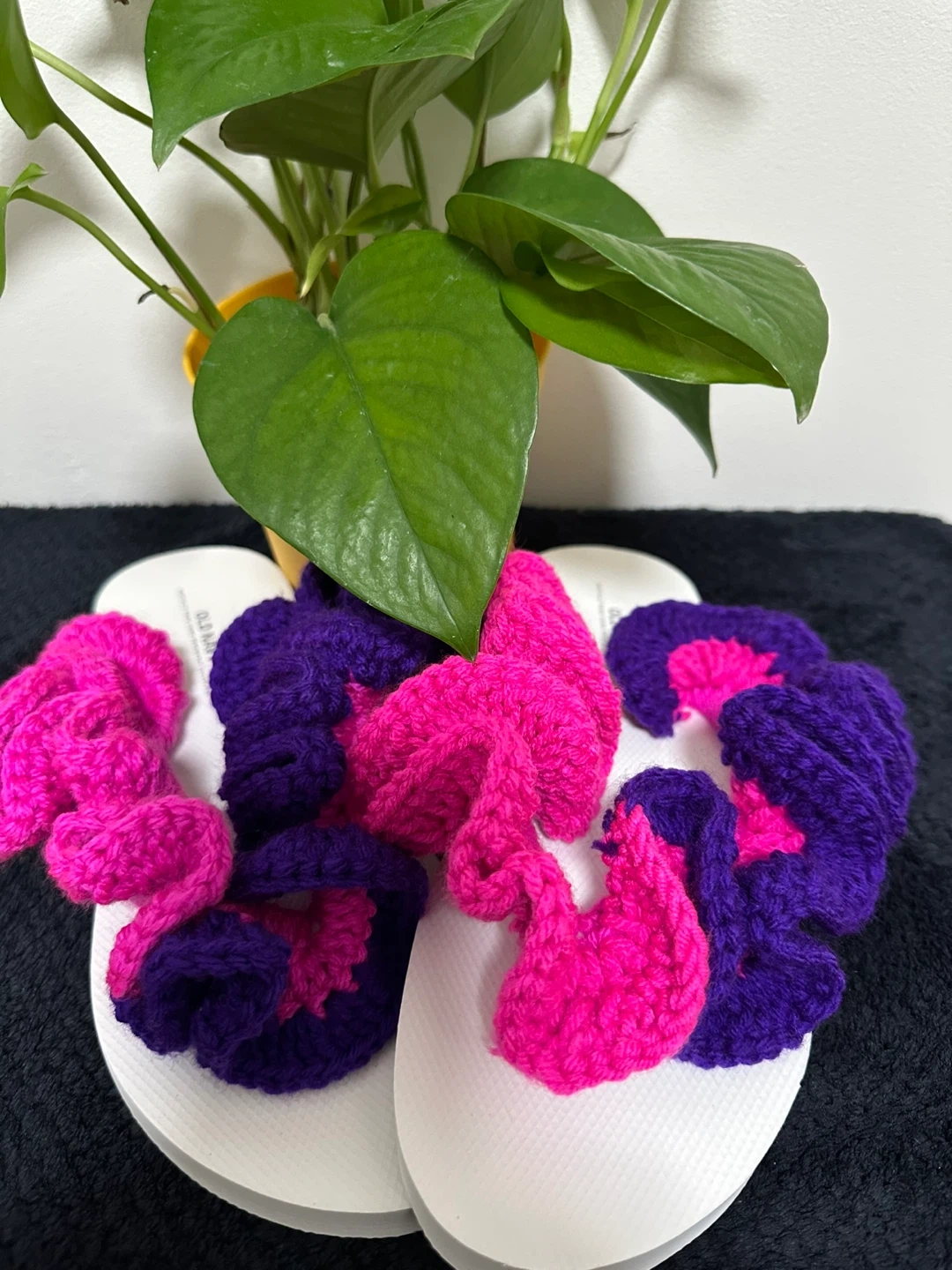 These handmade flip flops are so cute and comfy! They feature a unique crochet design in vibrant purple and pink colors. Perfect for adding a touch of handmade charm to your summer wardrobe!