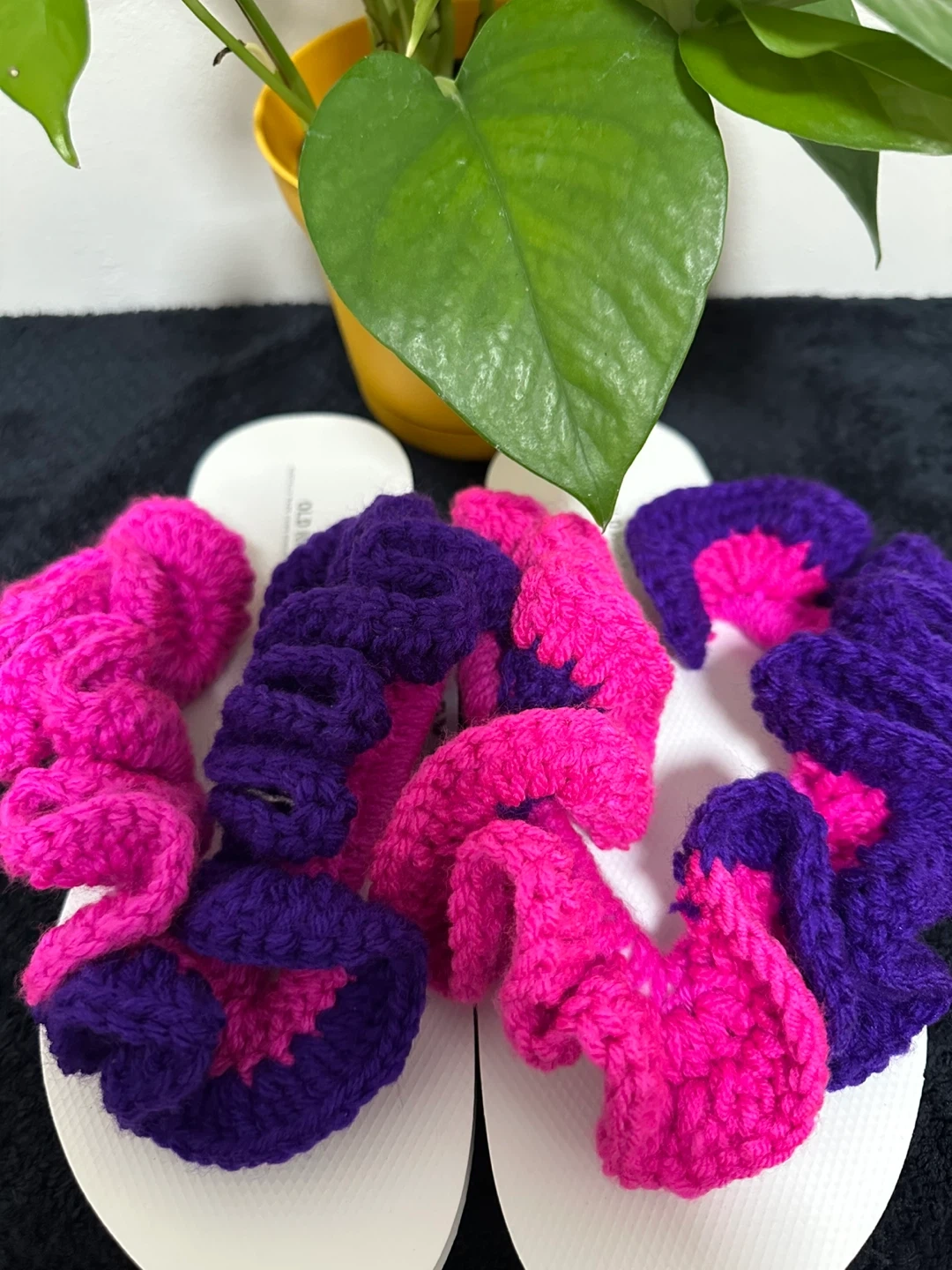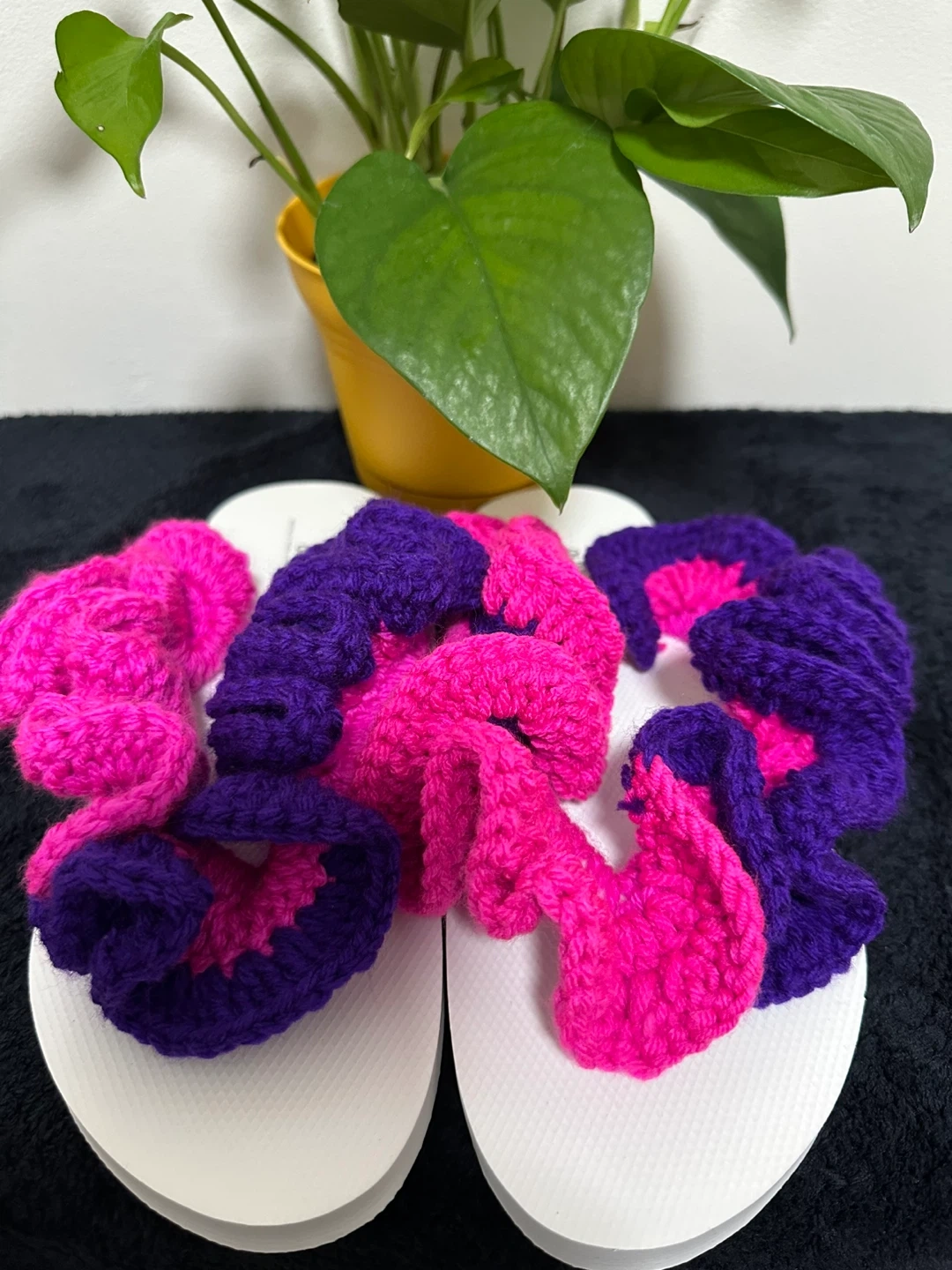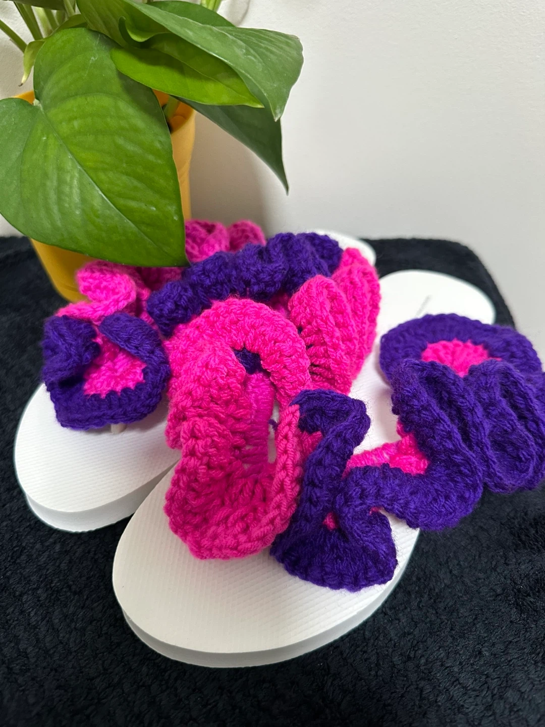 These handmade flip flops are so cute and comfy! They feature a unique crochet design in vibrant purple and pink colors. Perfect for adding a touch of handmade charm to your summer wardrobe!