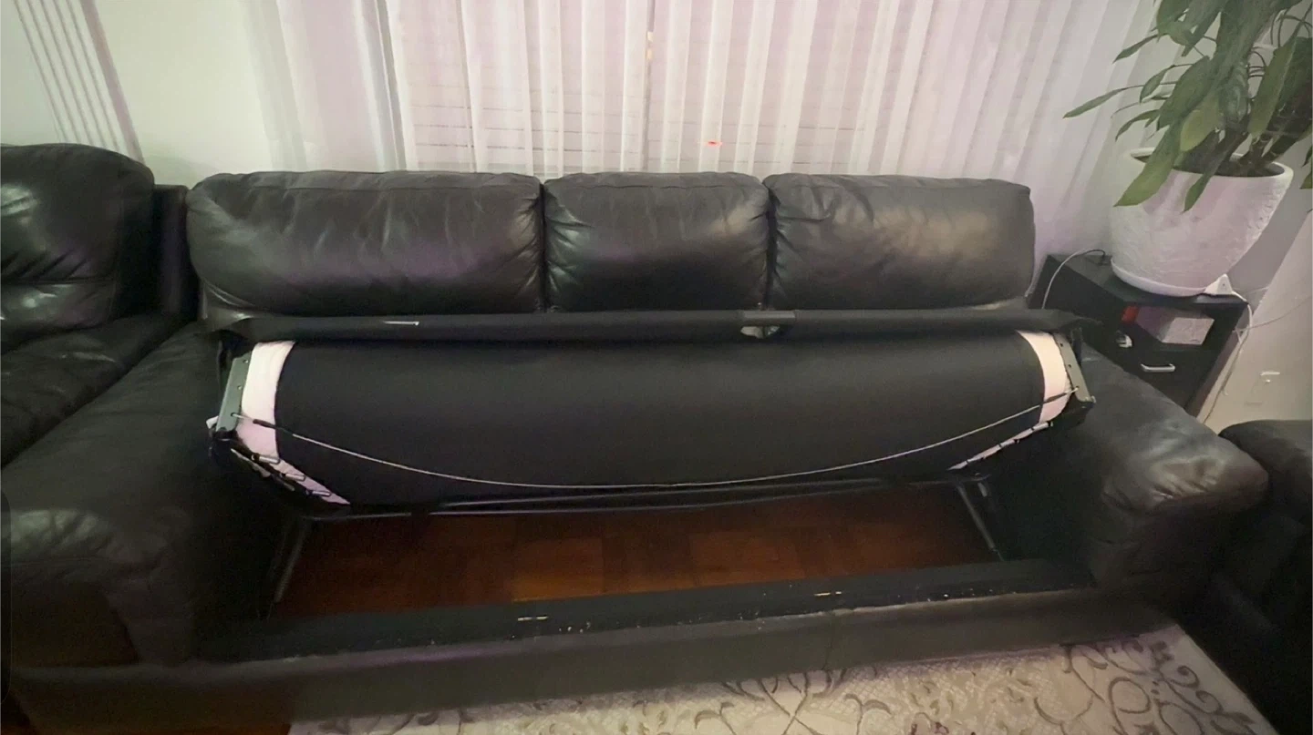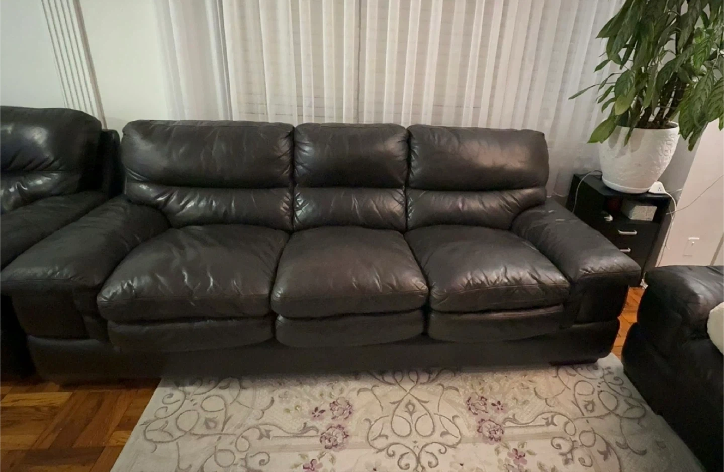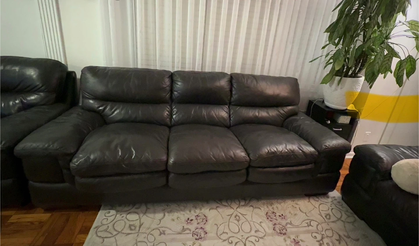 This is a brown leather sofa that converts into a sleeper. It features a pull-out mattress. It's a functional piece for extra sleeping space!