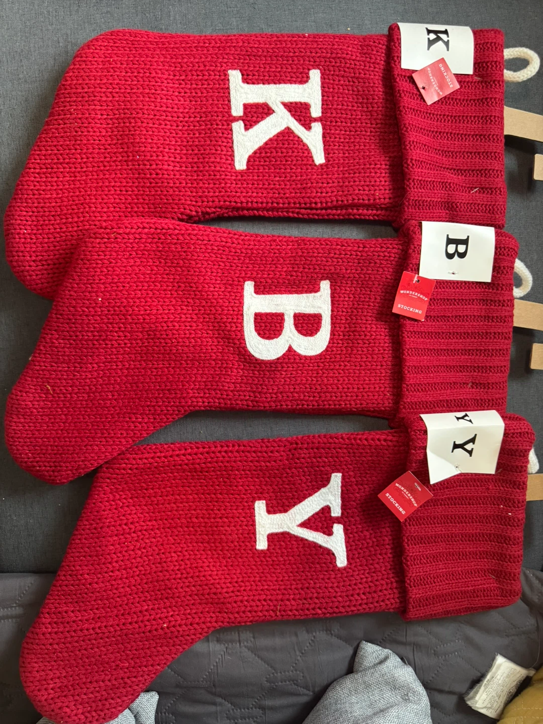 Three red knit Christmas stockings, each featuring a white embroidered initial: K, B, and Y. These stockings are ready for Santa's visit! They're perfect for adding a personalized touch to your holiday decor.
