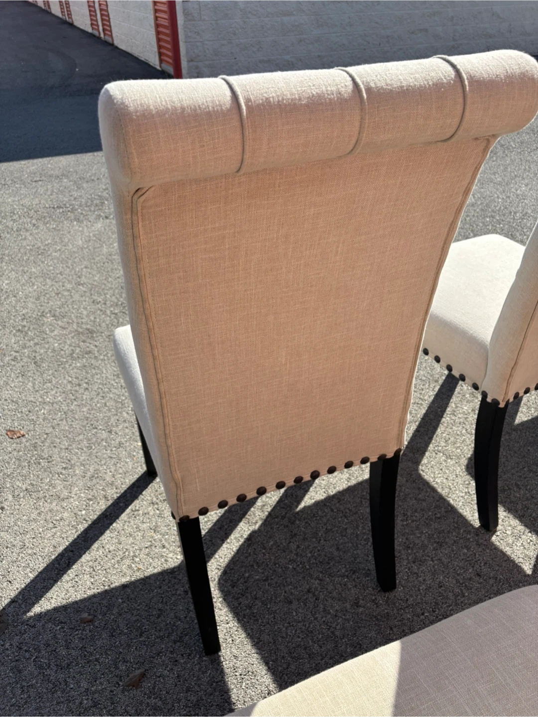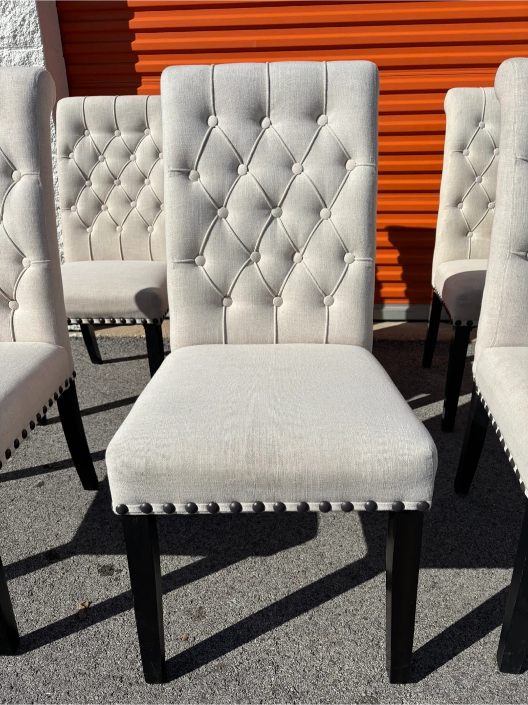 Six beige upholstered dining chairs with diamond tufting and nailhead trim. Features dark wood legs for a classic look. Perfect for a dining room or as accent chairs.