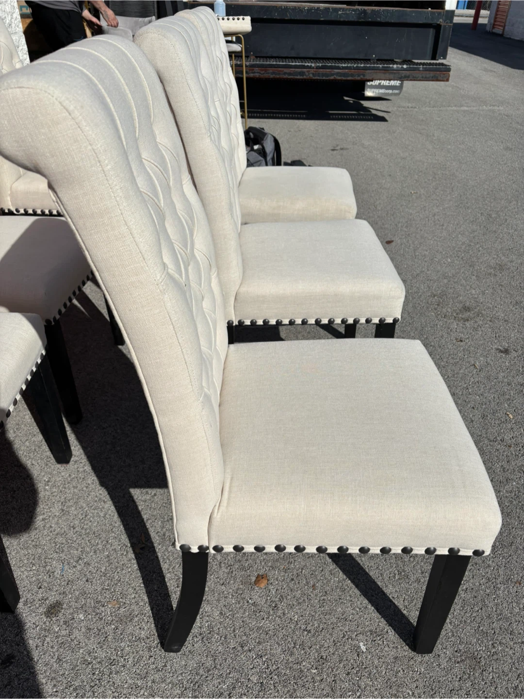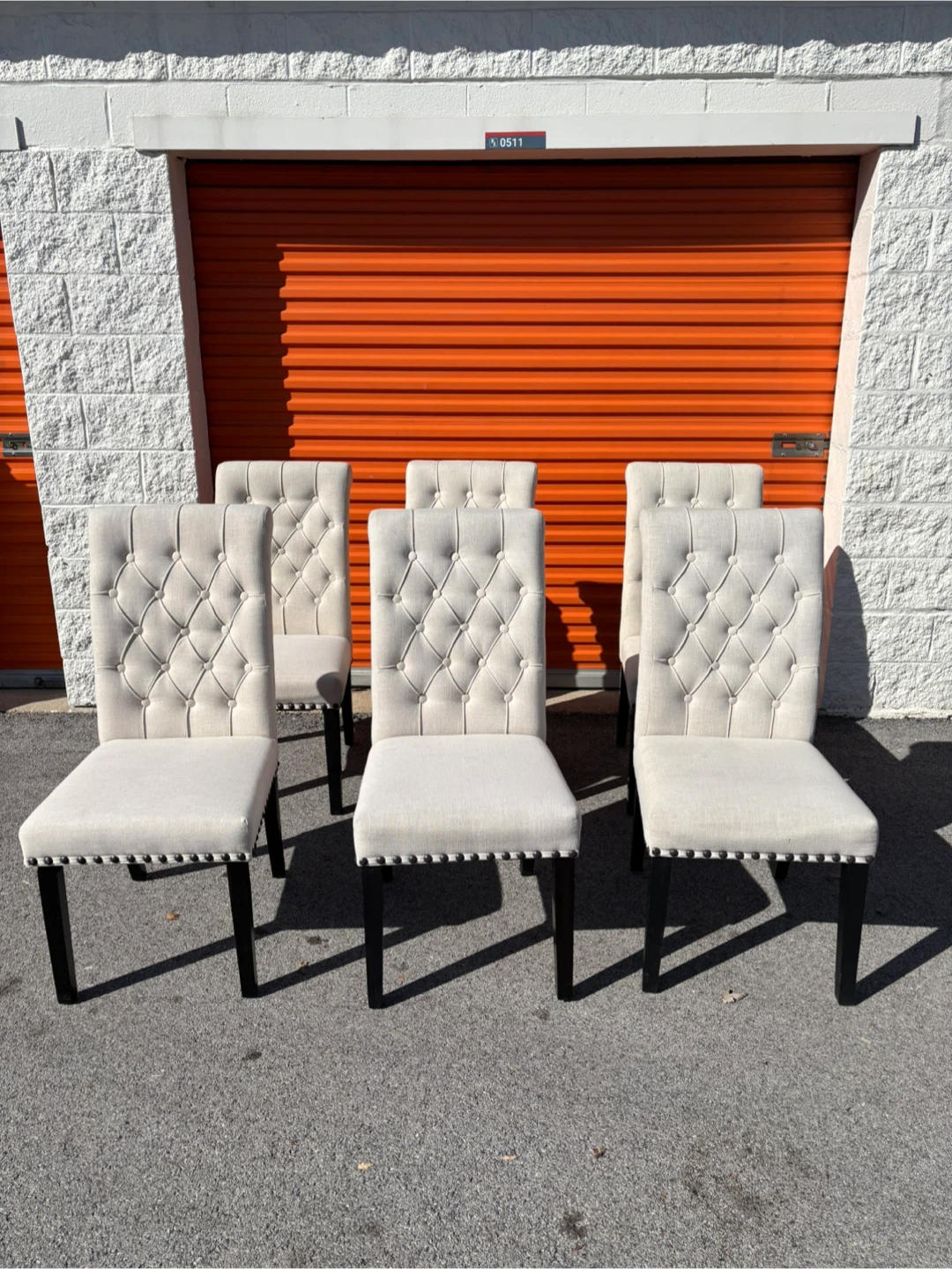 Six beige upholstered dining chairs with diamond tufting and nailhead trim. Features dark wood legs for a classic look. Perfect for a dining room or as accent chairs.