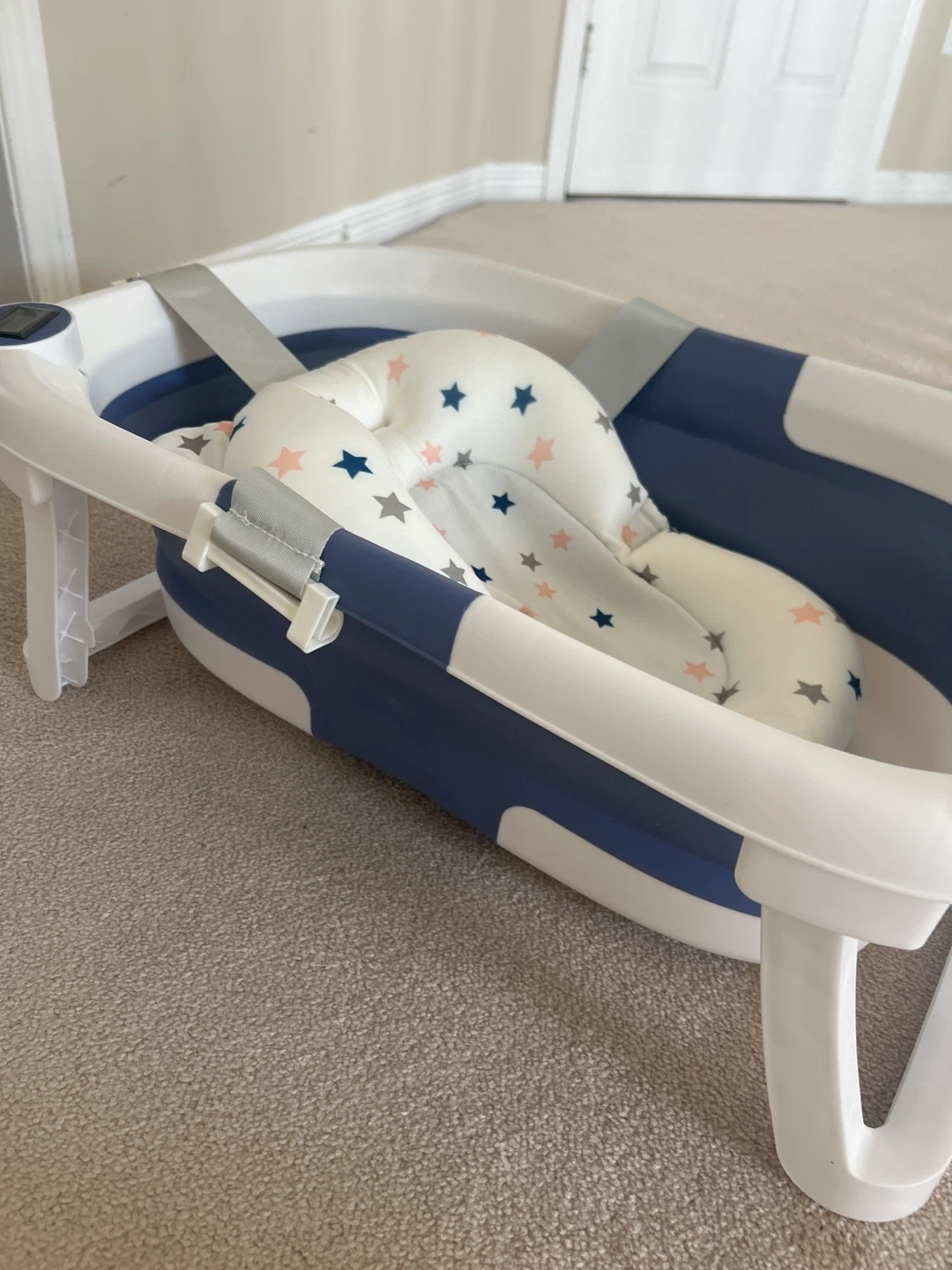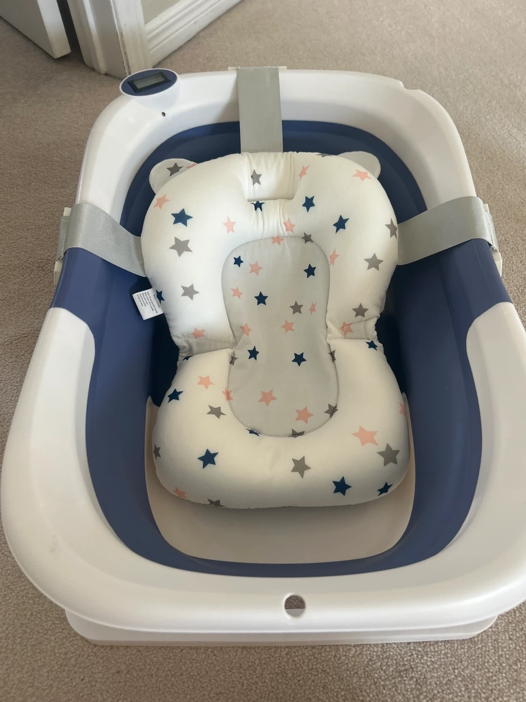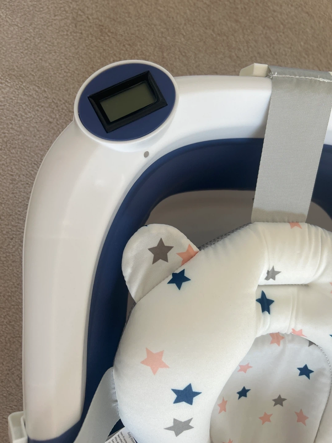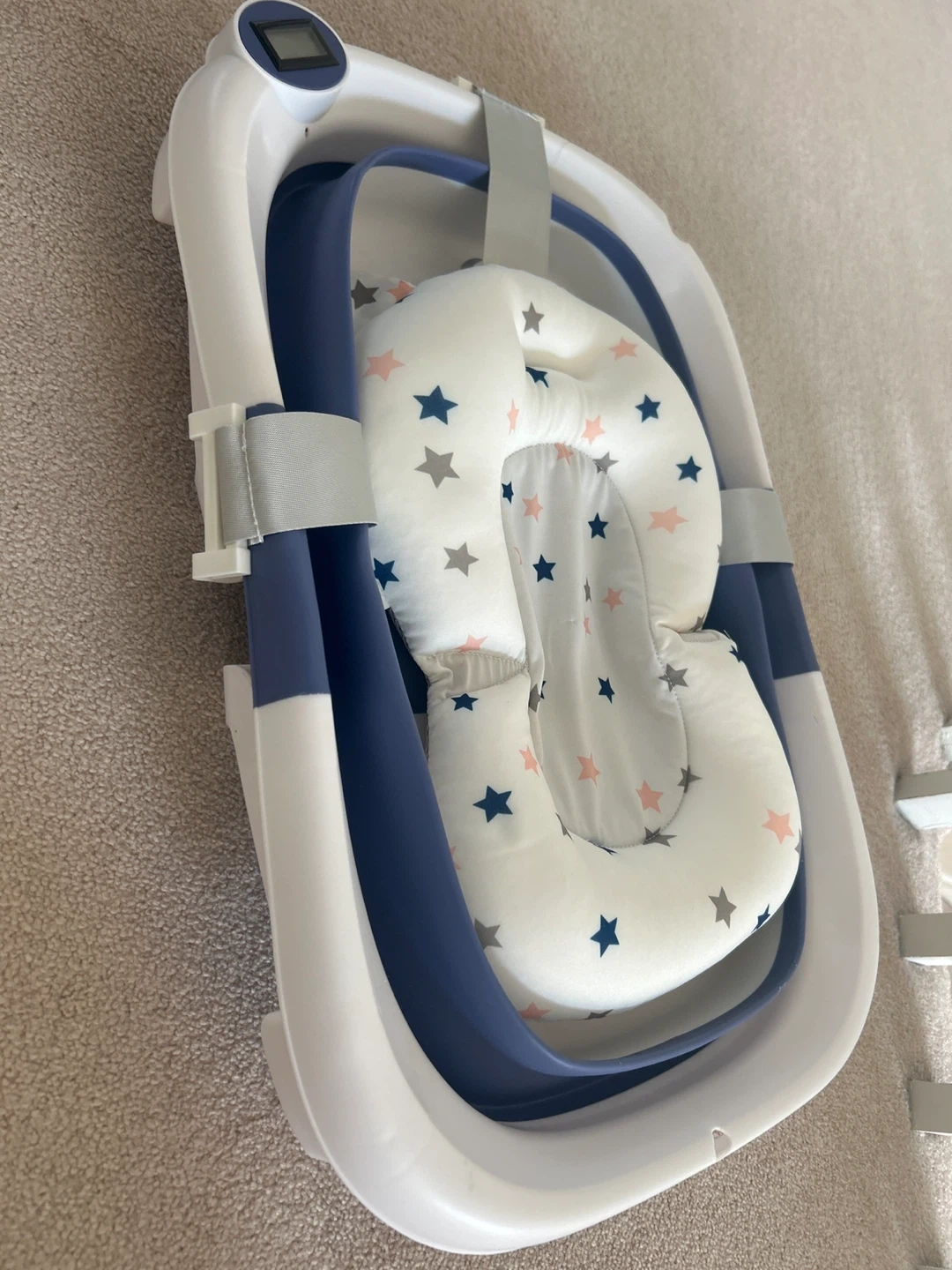 This foldable baby bathtub comes with a digital scale to easily track your baby's weight. It features a cute star-patterned infant support cushion for comfort. The tub is blue and white plastic. It's great for keeping track of your little one's growth during bath time!