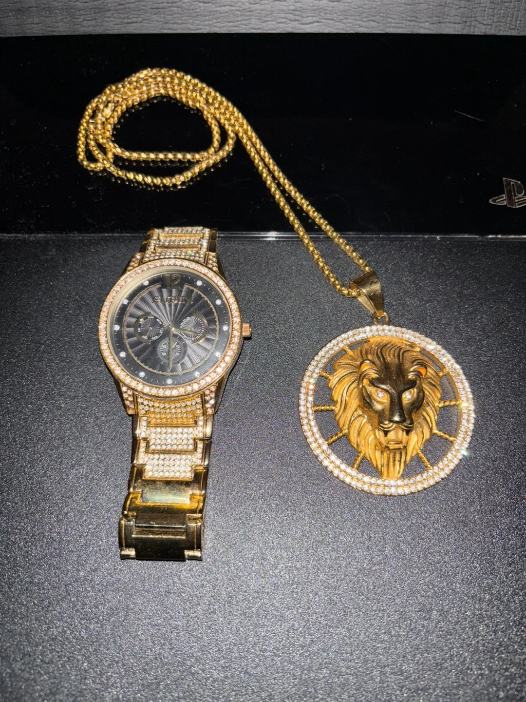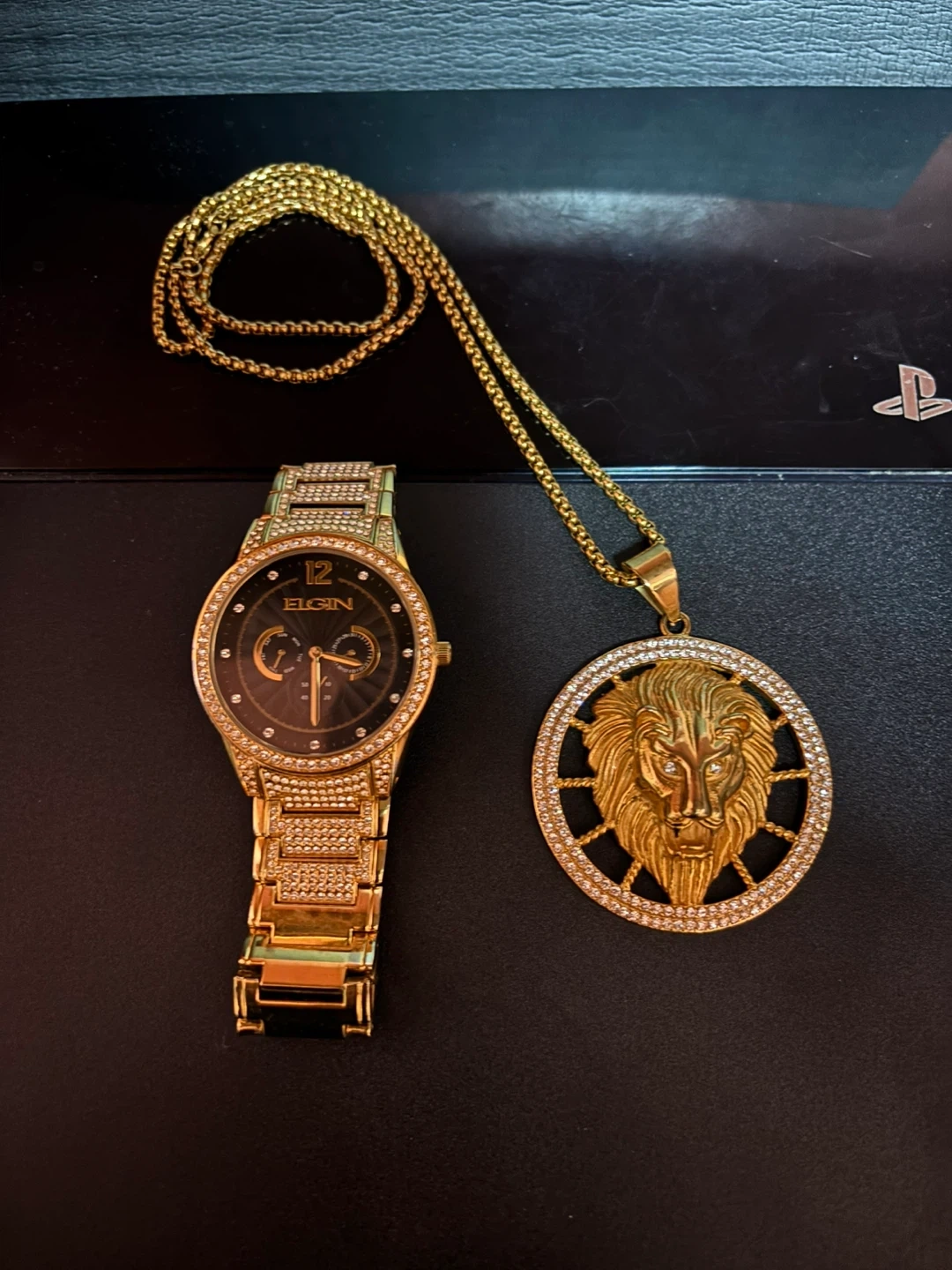 Selling a gold Elgin watch and a matching gold lion pendant necklace. The watch is adorned with crystals and has a black face. The necklace features a lion pendant with a circular crystal design. Both pieces are in good condition and ready to accessorize your outfit!