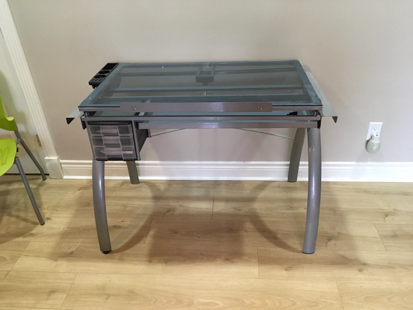 This drafting table has a glass top and a metal frame. It includes a set of small drawers for storage. The top is adjustable.