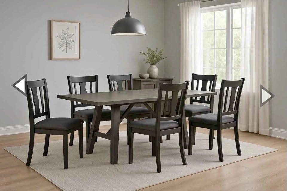 CLEARANCE SALE!!! Table crafted from solid rubberwood with an acacia veneer top; chairs built from sturdy rubberwood with birch veneer accents for a cohesive, long-lasting set. Features an 18" removable extension leaf, making it easy to accommodate additional guests. Table designed with splayed legs that offer excellent stability and a modern, sculptural look. Chairs include contoured backs that provide comfortable, supportive posture for everyday dining. Chair seats use 20 kg foam density for balanced comfort and long-term durability. Let me know if you're interested!