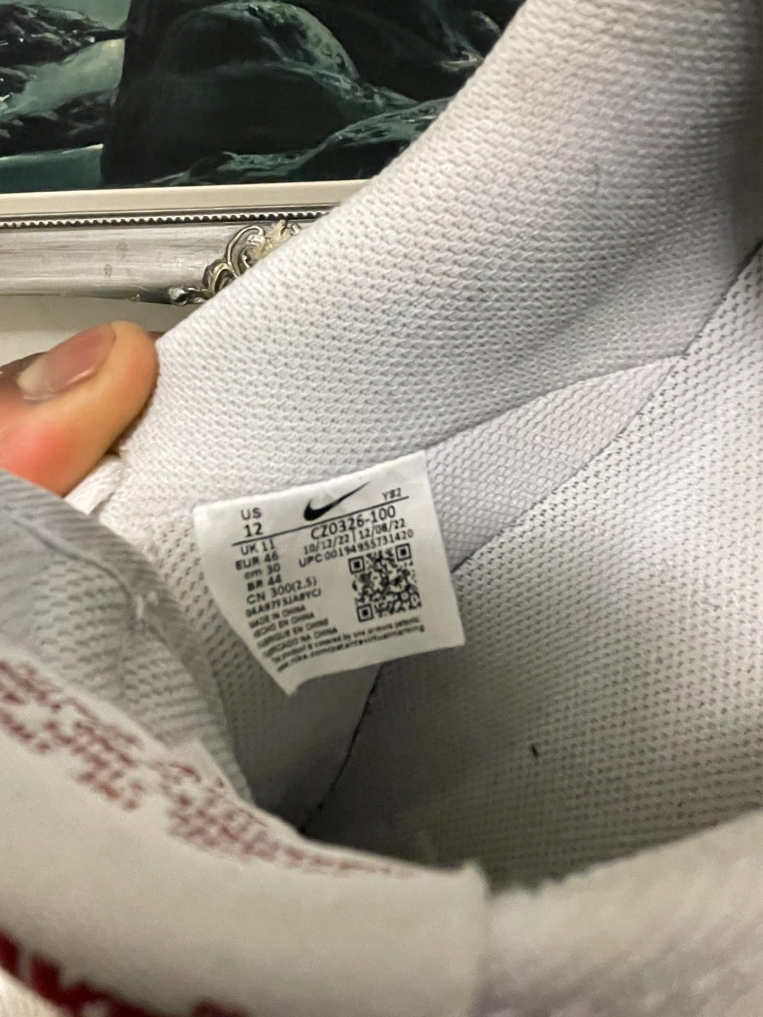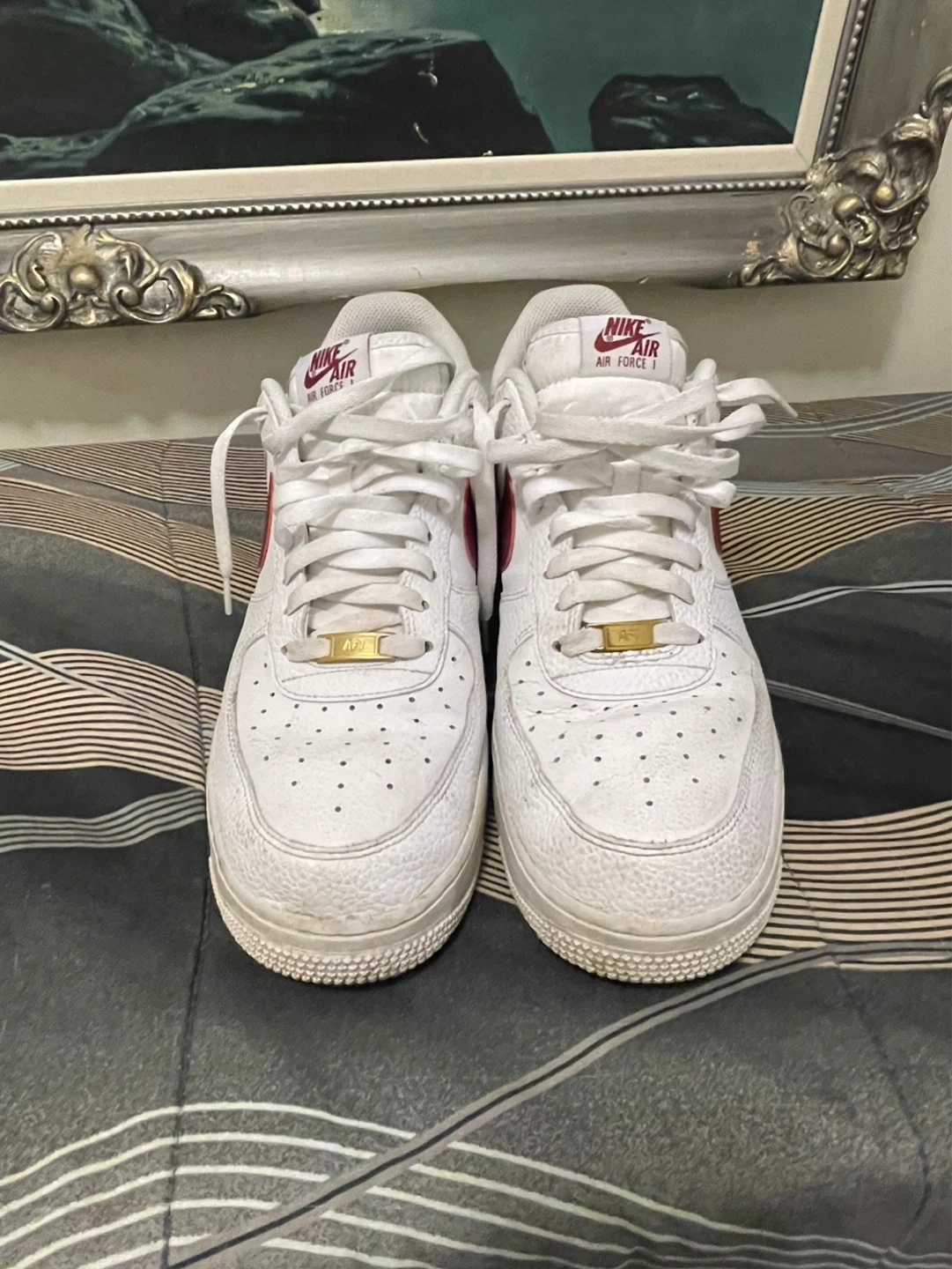 Classic white Nike Air Force 1 sneakers with burgundy accents. Men's US size 12. Leather material. And don’t worry I’m getting it cleaned up so please come see for yourself.