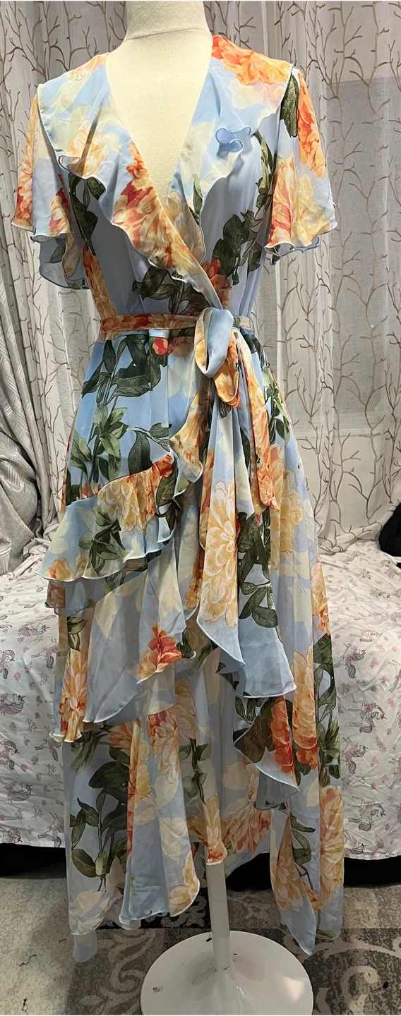 Beautiful light blue maxi dress with a vibrant floral print and ruffled details. It features a flattering wrap style with a tie waist and short flutter sleeves. Made from a lightweight, flowy material, perfect for warmer weather!