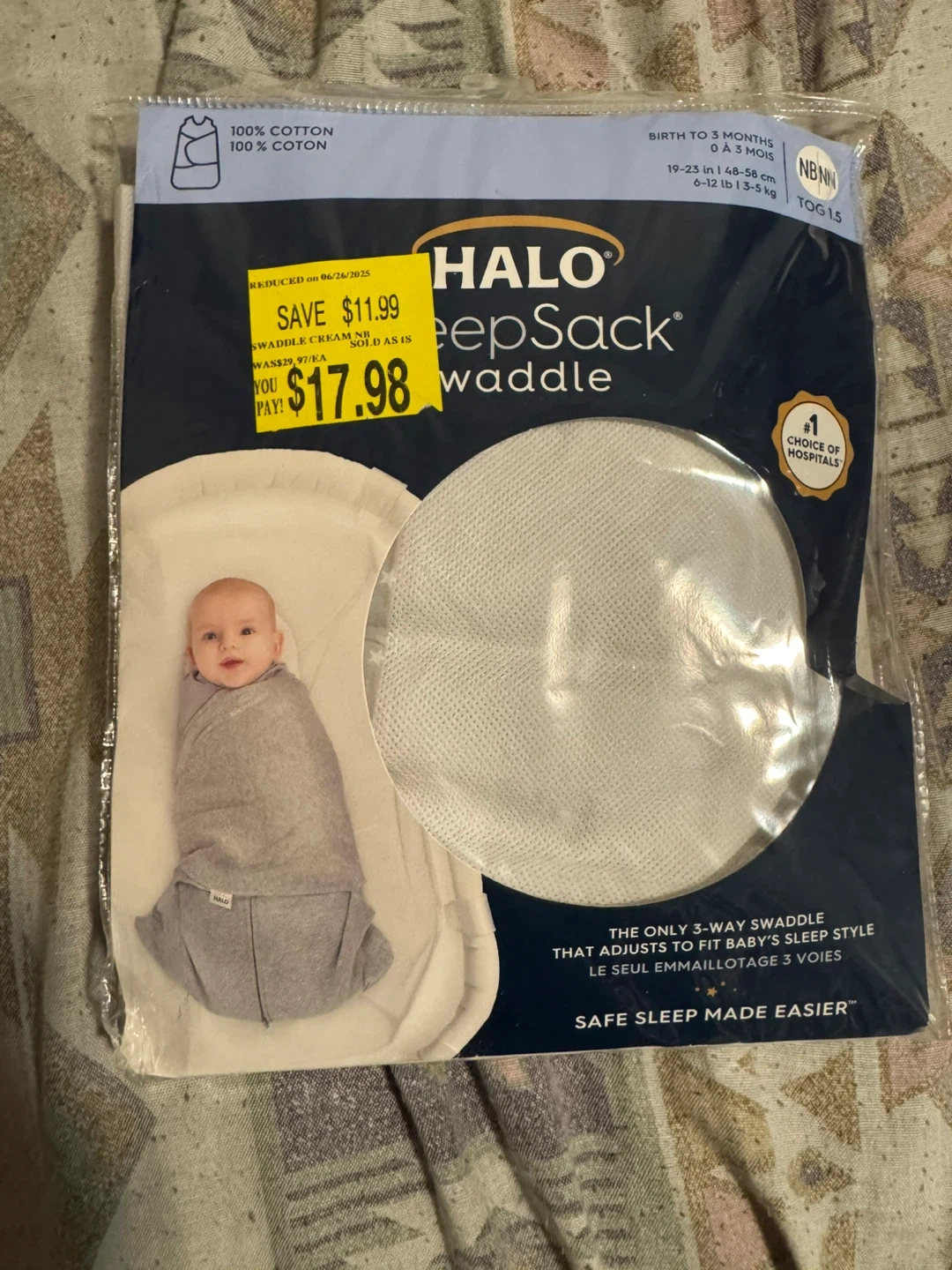 Selling a brand new Halo Sleepsack Swaddle, perfect for newborns up to 3 months (6-12 lbs or 19-23 inches). This is the swaddle cream colour. It's the only 3-way swaddle that adjusts to fit baby's sleep style, making safe sleep easier. Originally priced at $29.97, you can save!