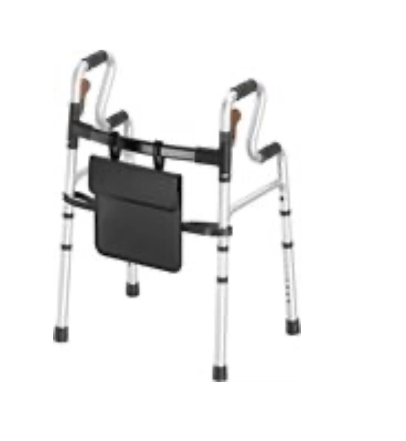 This is a folding walker with a black storage bag attached. It's made of aluminum and features adjustable height legs. It folds for easy storage and transport.