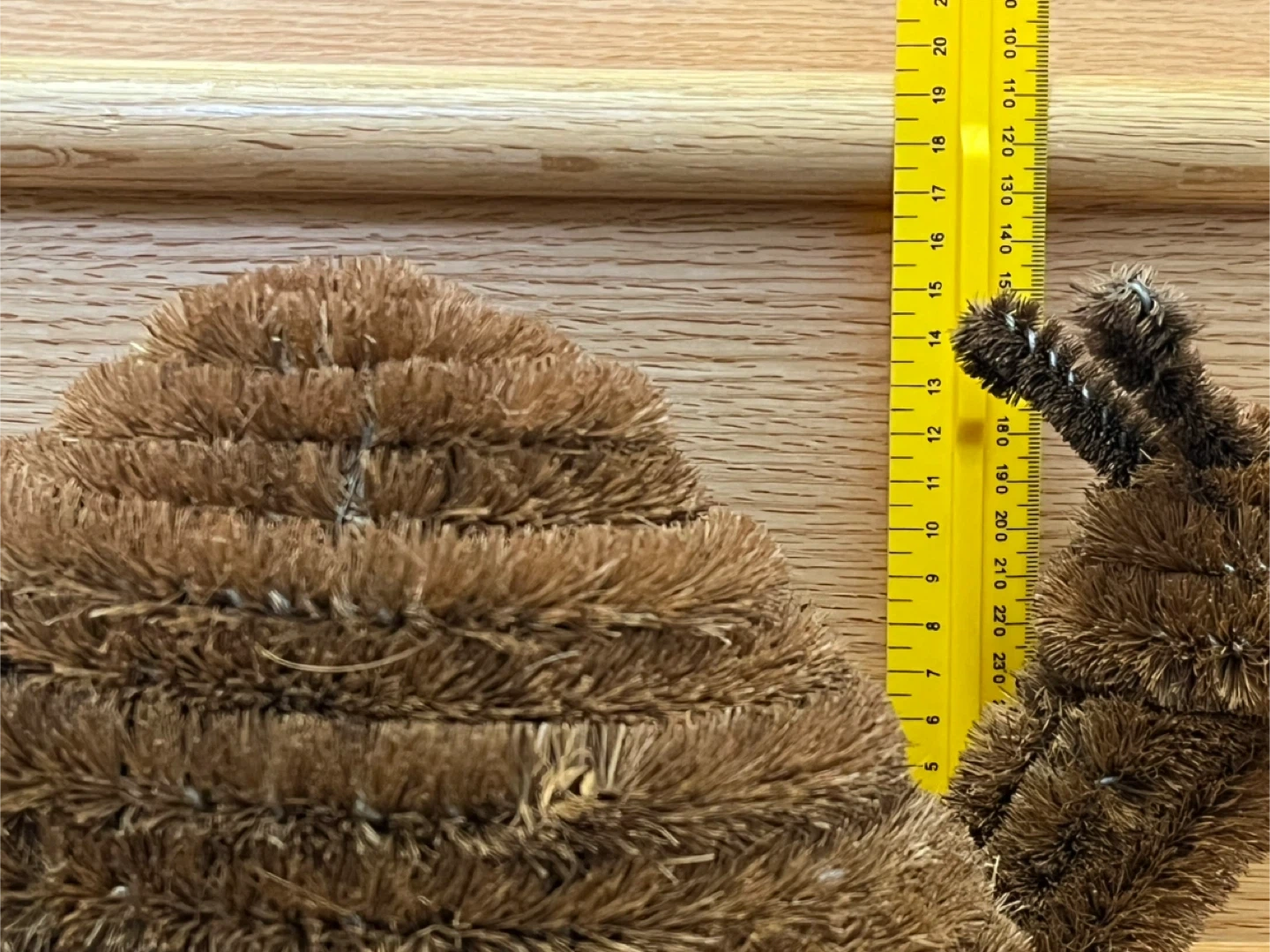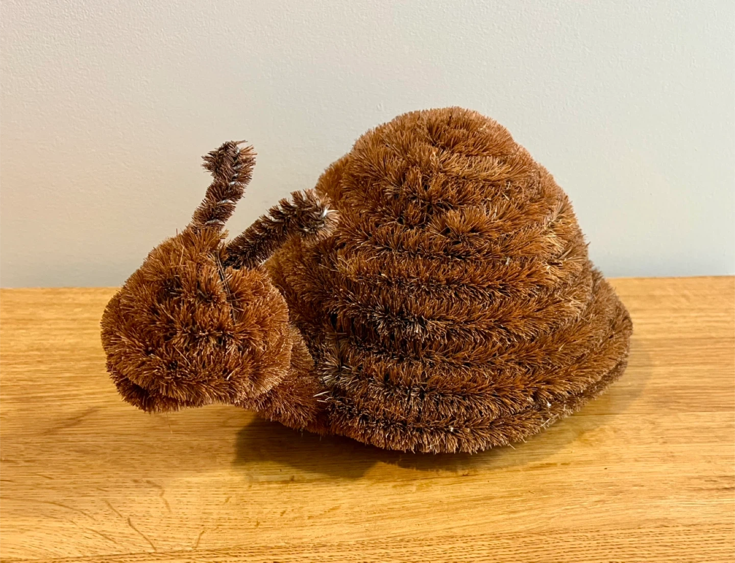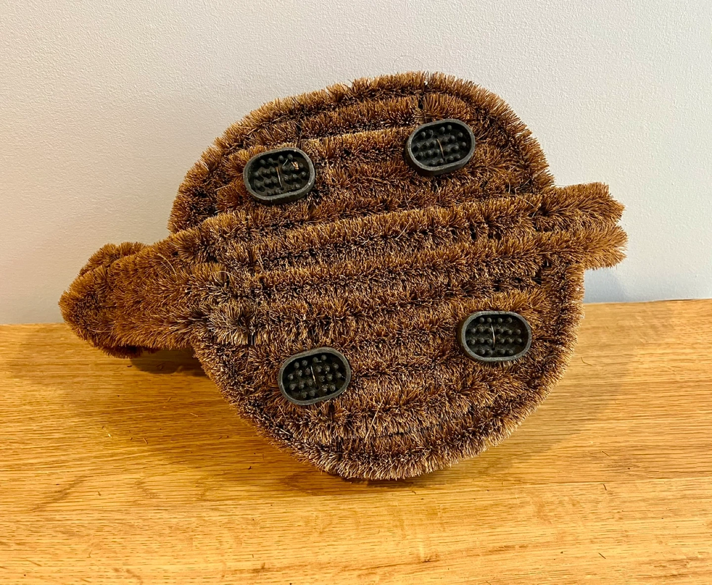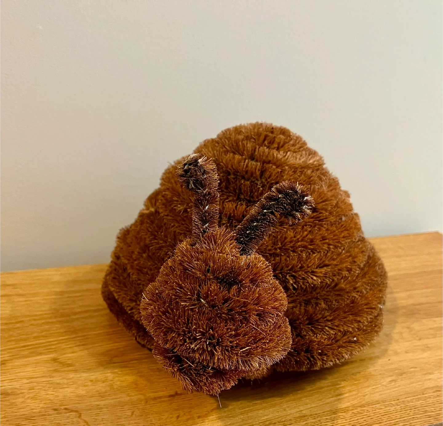 Cute snail-shaped Doormat Brush. It's made from coconut coir bristles with a wire frame and has anti-slip black rubber feet on the bottom. This scrubber adds a whimsical touch to your doorway.