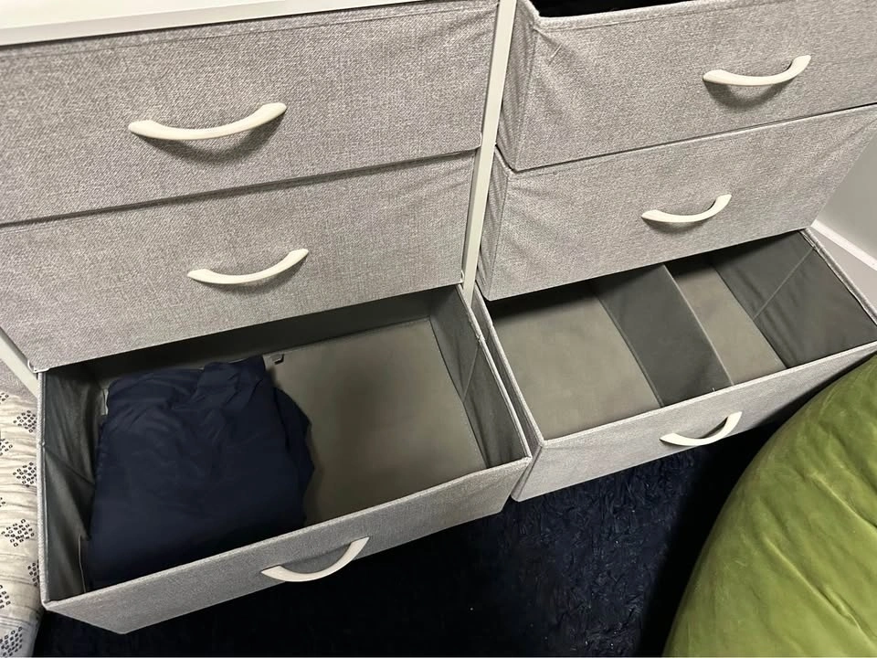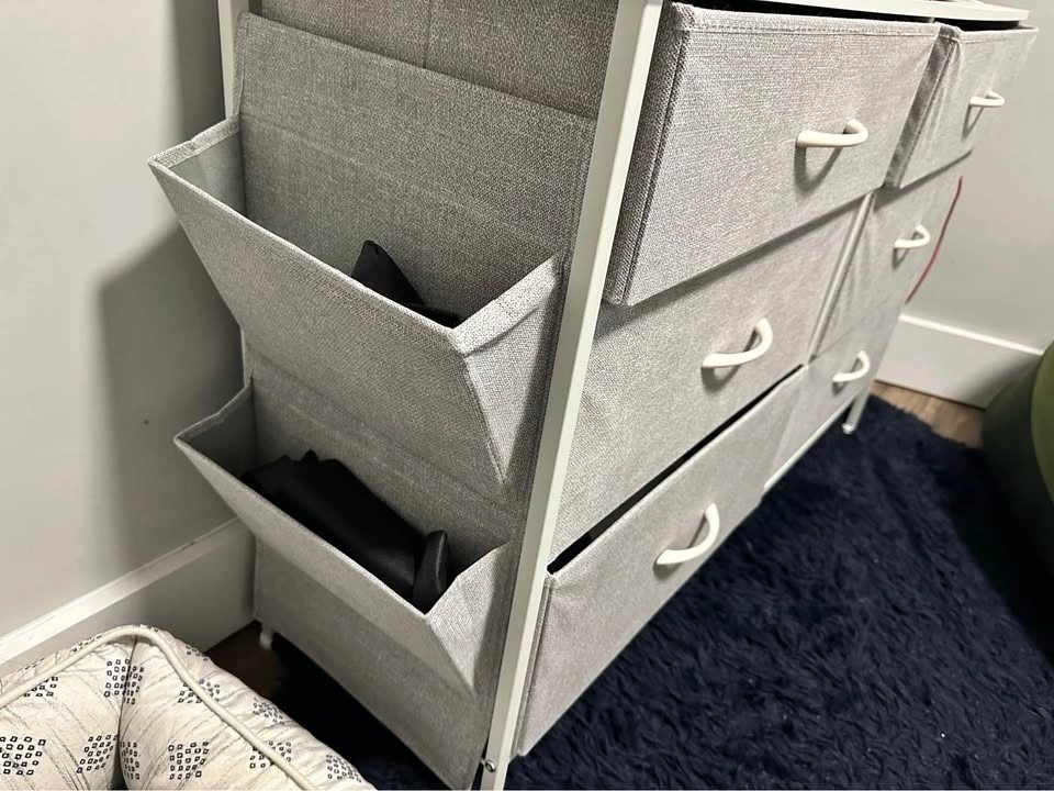 Versatile fabric dresser with 6 light gray drawers and white handles. White frame. Good for clothes, toys, or extra storage. Some drawers come with organizers inside, handy for keeping things neat.