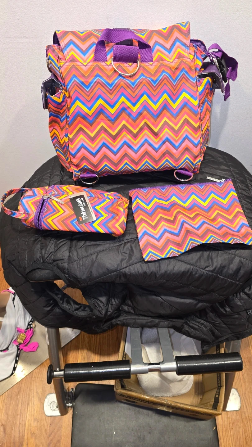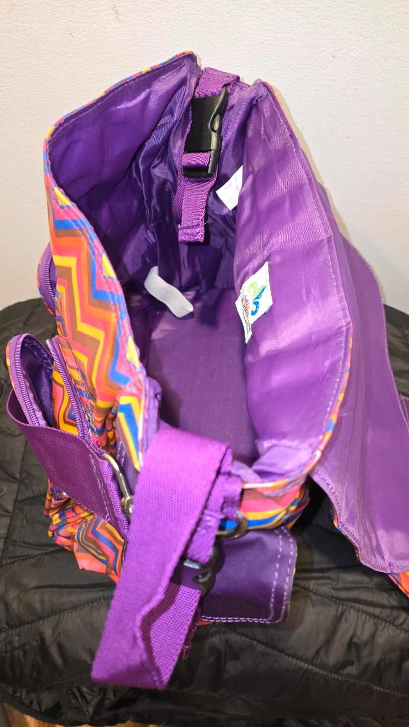 diaper bag with a colourful chevron pattern. It comes with a matching small zippered pouch and a thinsulate bottle cover. The bag has a purple strap lots of pocket clips and spots to clip or tie things. It's brand new and ready for a family!