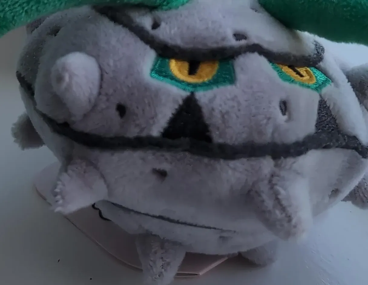 Soft grey plush toy of Ferrothorn with green accents and embroidered eyes. Great for any pokemon fan that likes the defense!