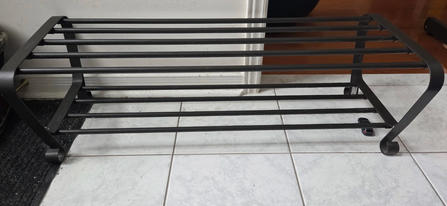 A sturdy metal shoe rack with two tiers. It's perfect for organizing footwear in your entryway or closet. This rack holds multiple pairs of shoes neatly.