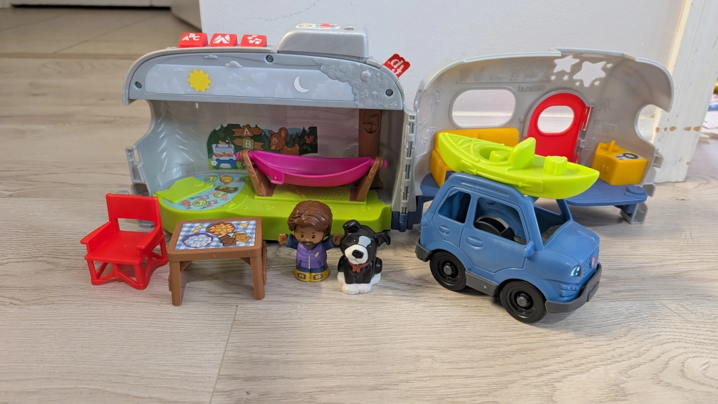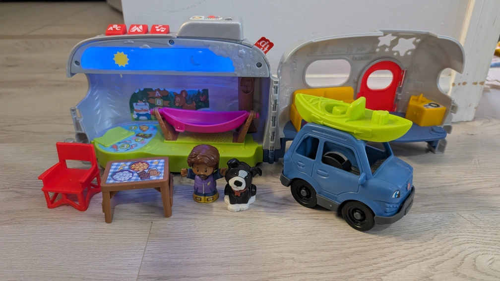 Get ready for a fun camping adventure with this Fisher-Price Little People set! It includes a camper, a car with a kayak, a table, a chair, two Little People figures, and a dog figure! Perfect for imaginative play and creating camping stories