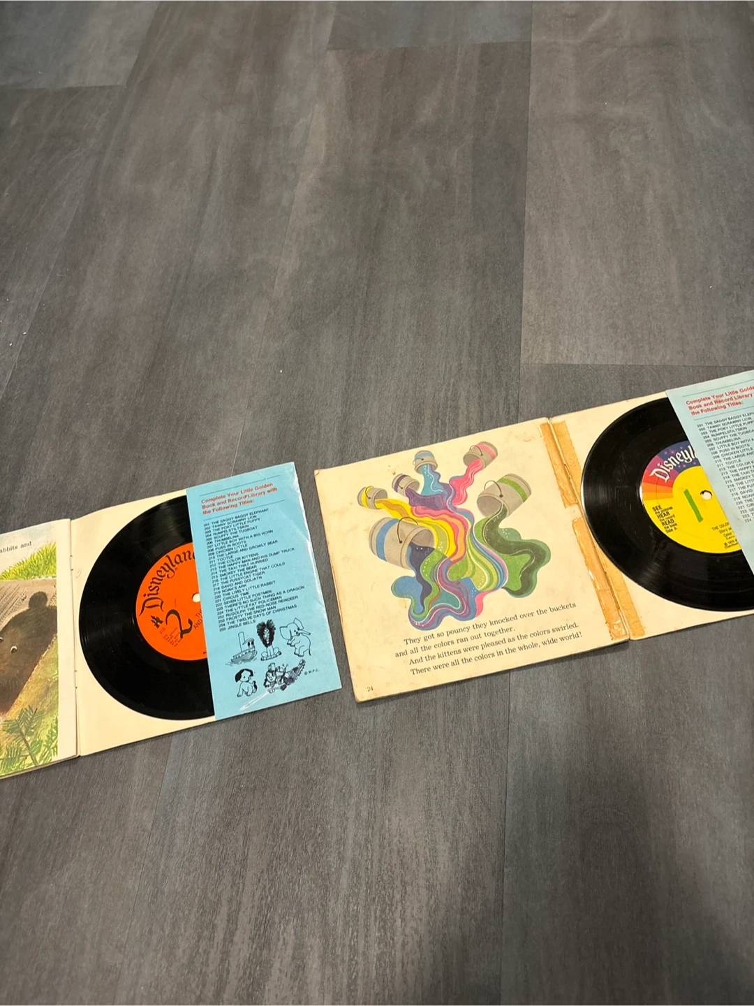 This is a set of two Little Golden Book & Record books. Includes 'The Large and Growly Bear' and 'The Color Kittens'. Both books are 24 pages and include a 33 1/3 RPM record. They have been very well loved as you can see over the years.