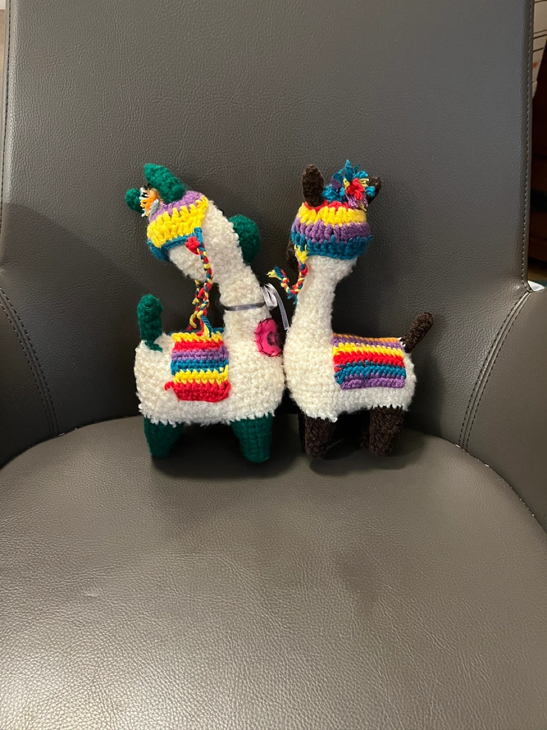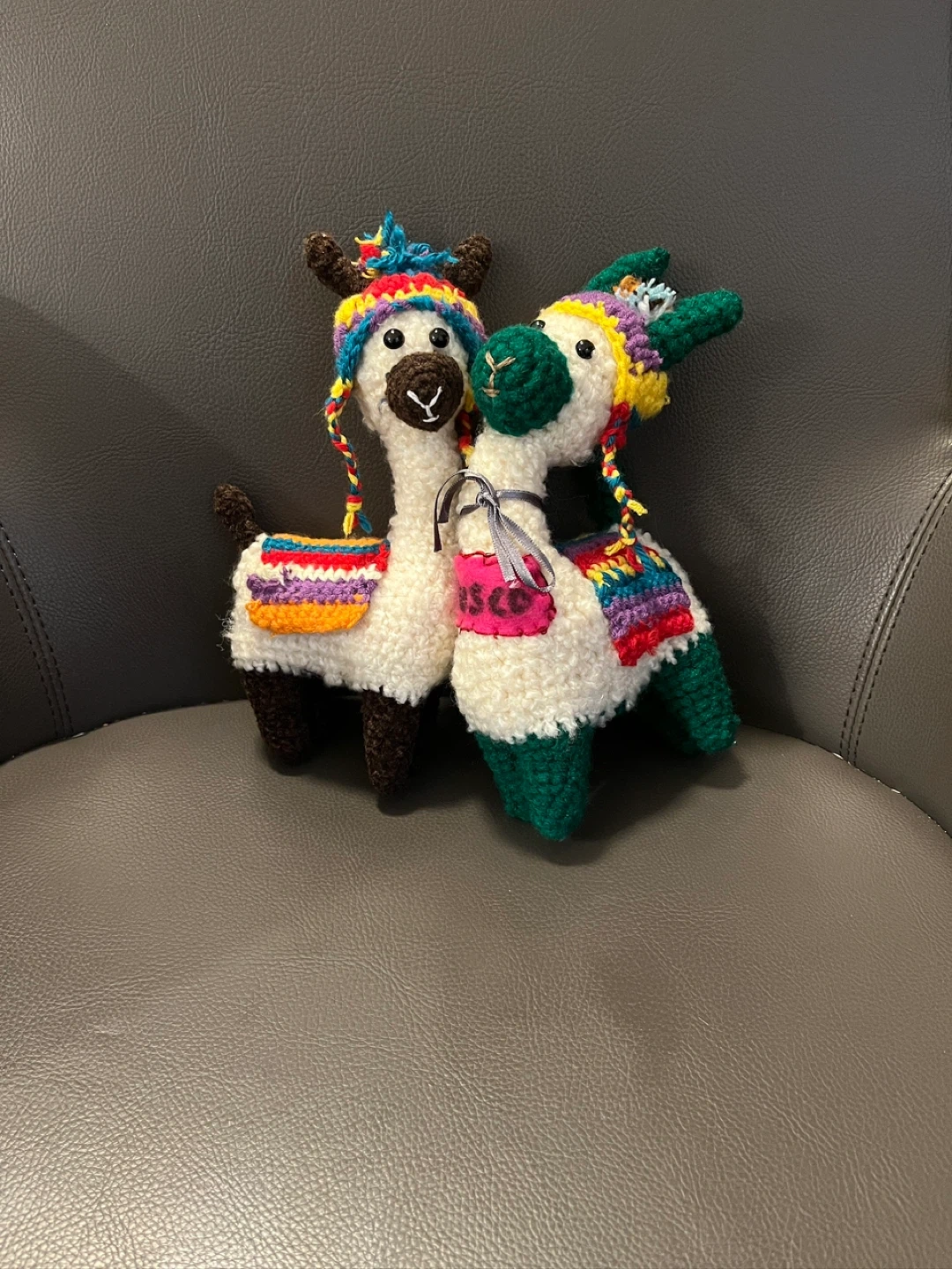 Handmade crocheted llama plush toy. It's white with colourful accents and comes with a removable blanket. This cute stuffed animal is a fun decorative piece. Perfect for adding a pop of colour to any room!