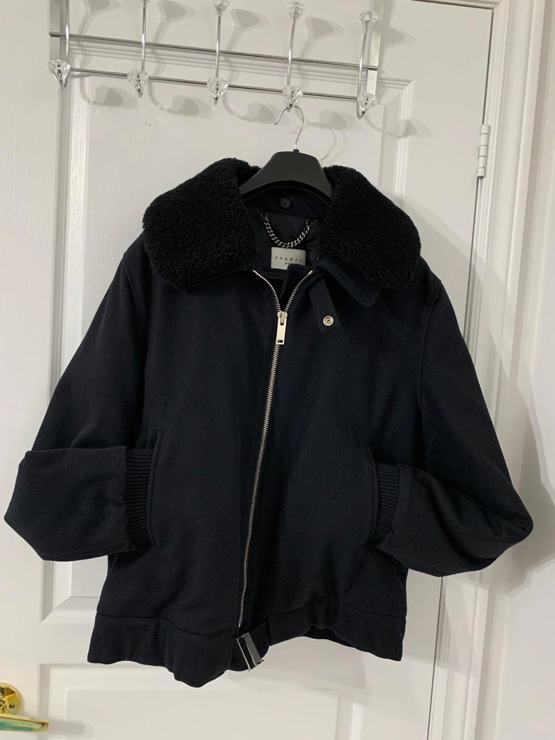 Selling a super stylish Sandro Paris bomber jacket! It's a sleek black colour and made from a cozy wool blend. The jacket features a cool faux fur collar and a chain detail inside. Perfect for adding a touch of Parisian chic to your wardrobe!