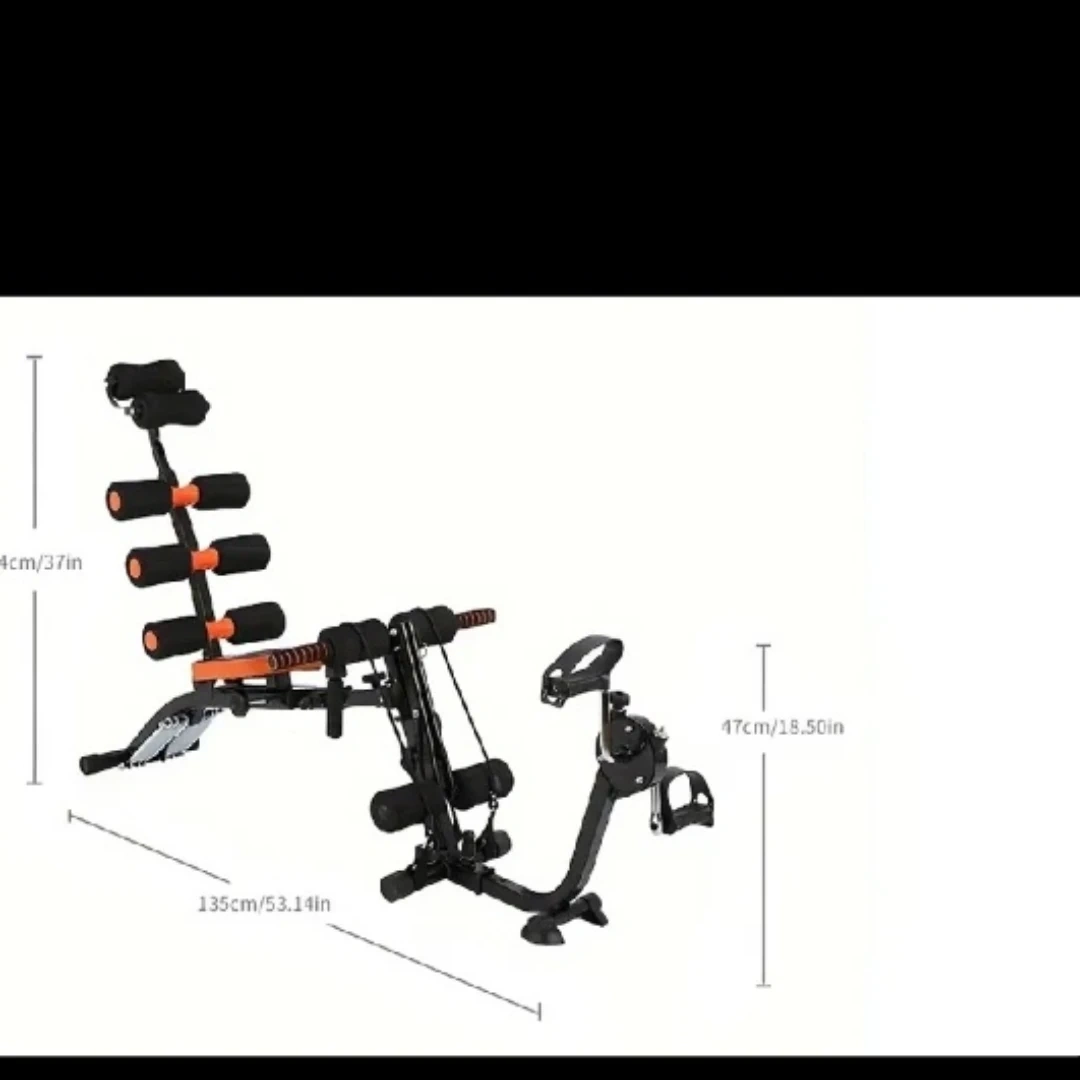 This is an abdominal exercise machine. It measures 135cm long, 94cm high, and 47cm wide. It includes padded rollers for comfort.