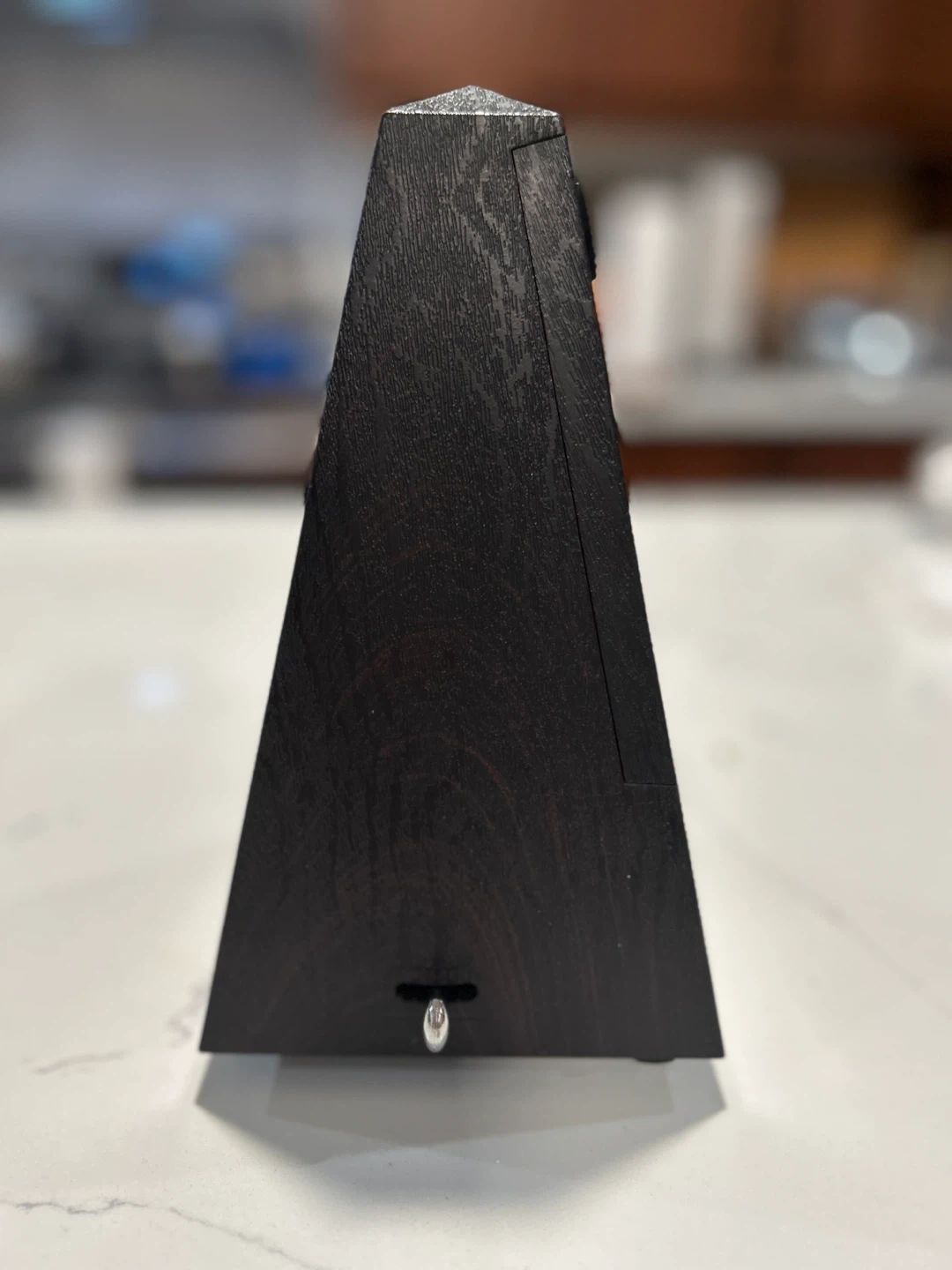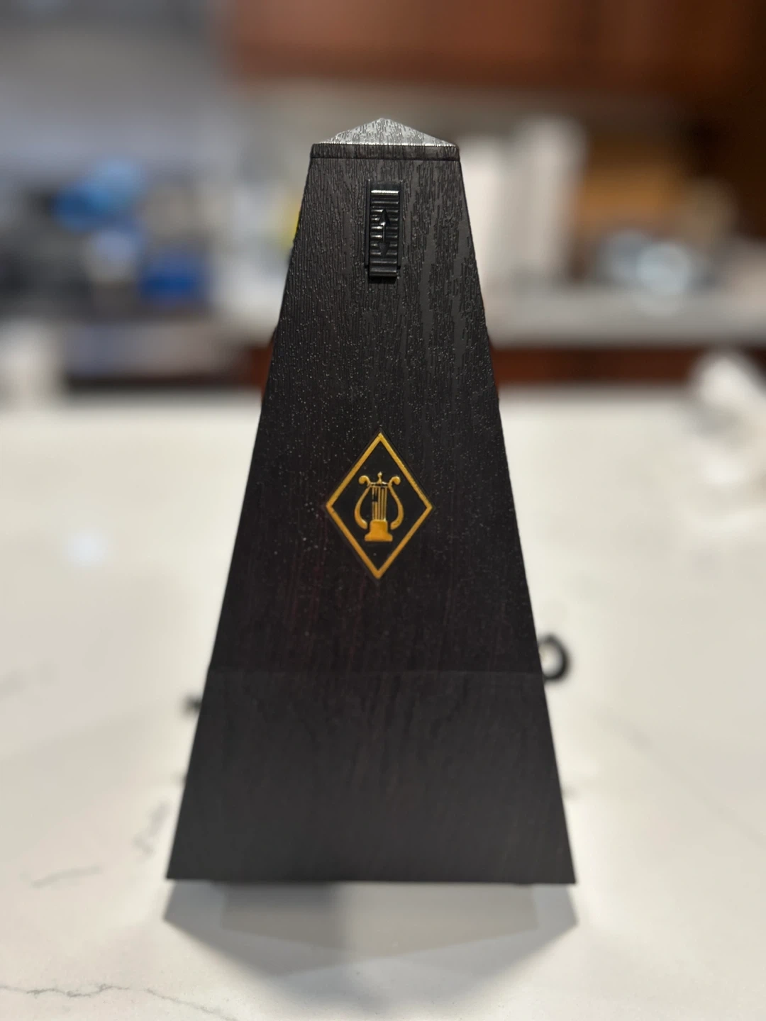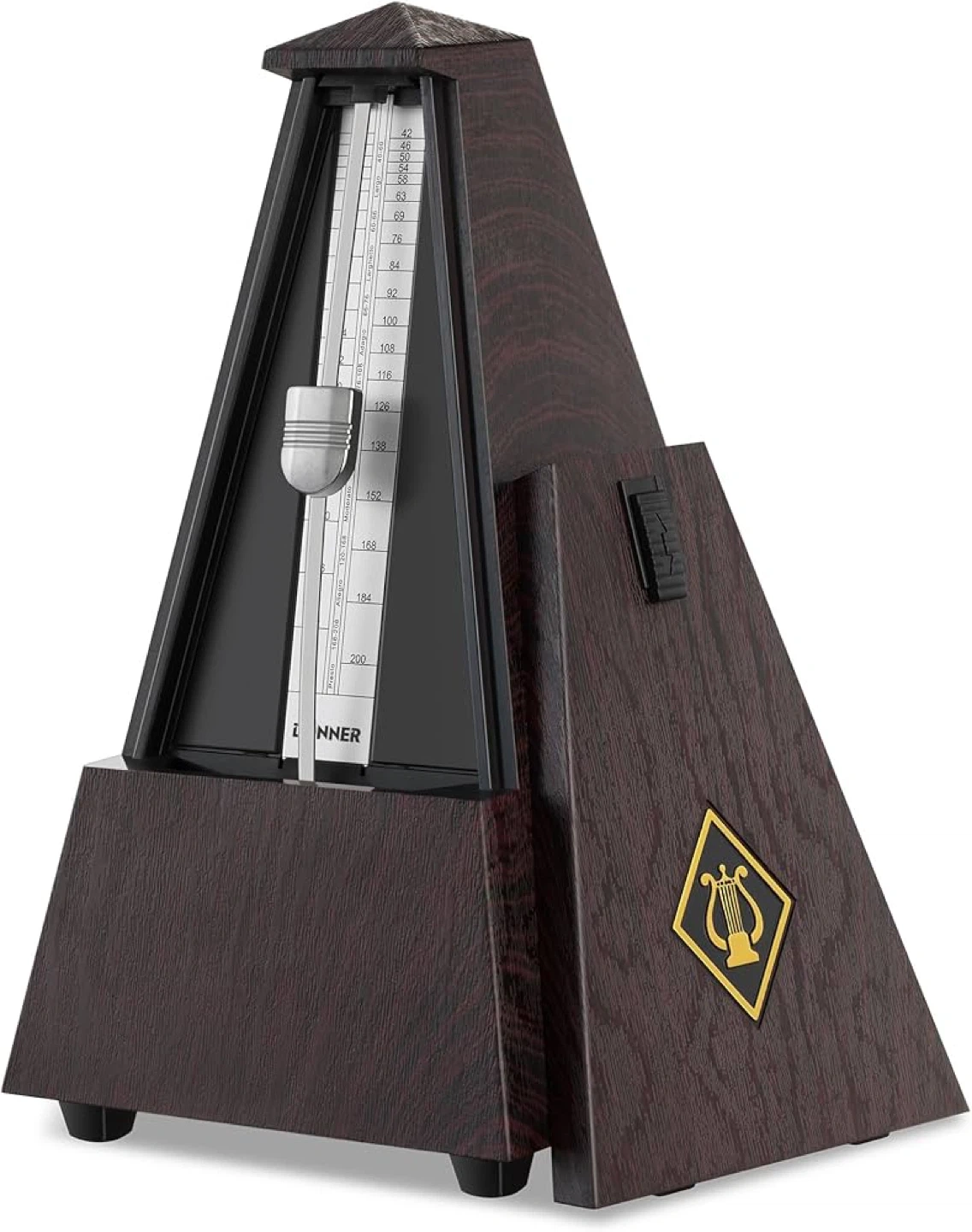 This is a Donner pyramid-style metronome. It offers 5 rhythm patterns and adjustable beats, with a tempo range of 40-208 bpm. Made of wood.