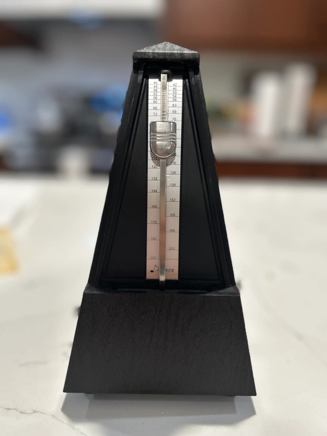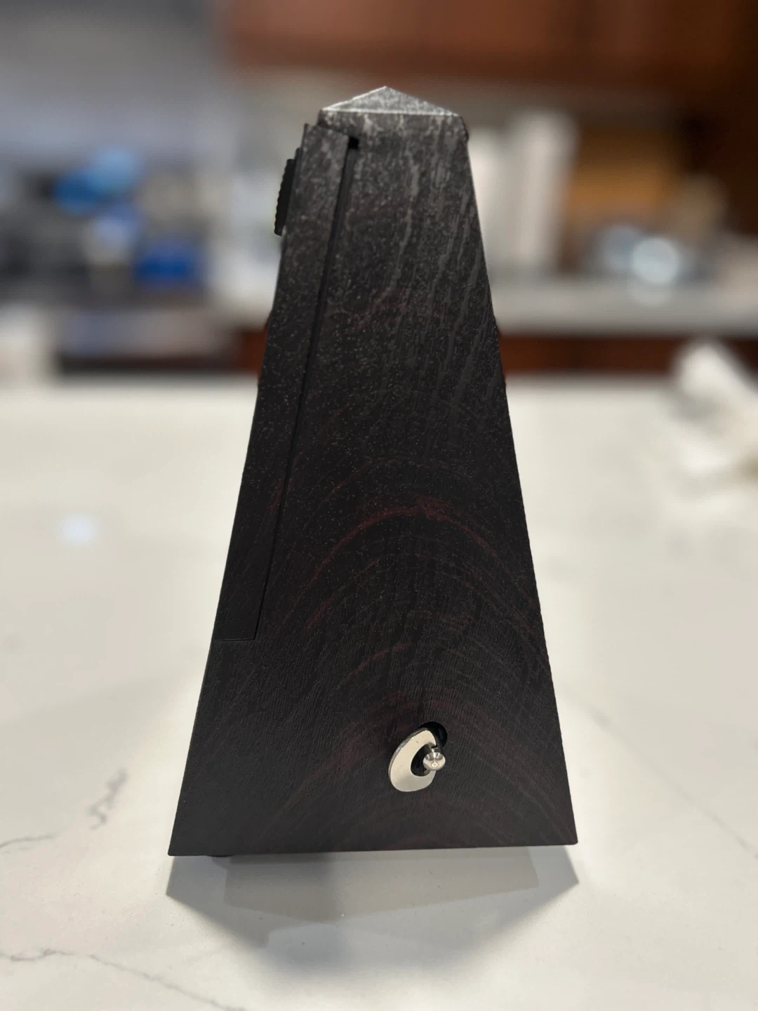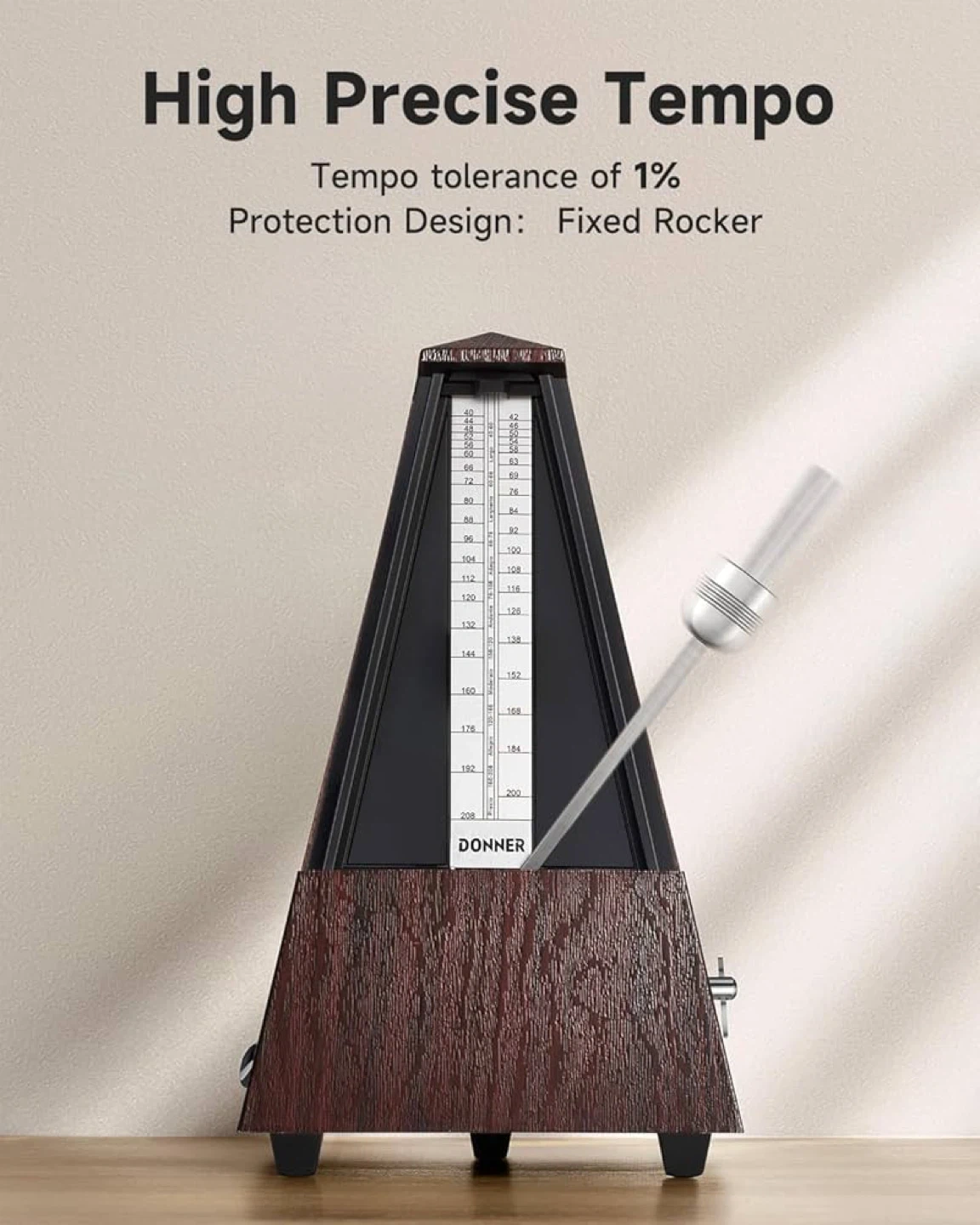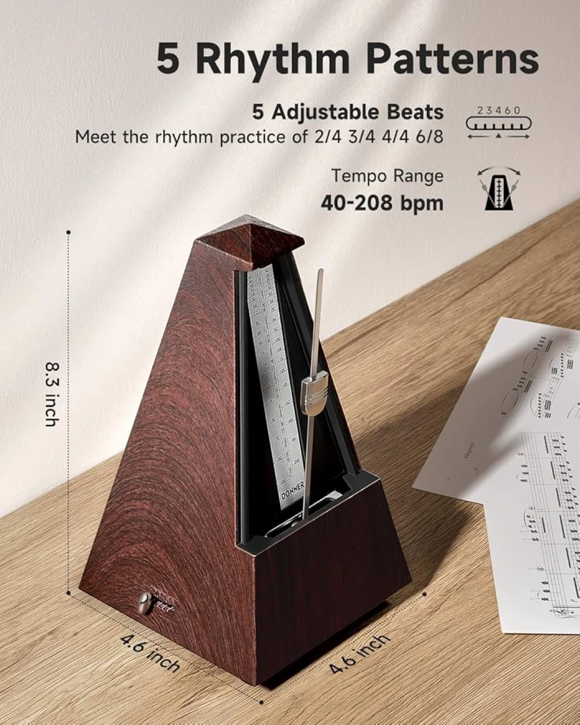 This is a Donner pyramid-style metronome. It offers 5 rhythm patterns and adjustable beats, with a tempo range of 40-208 bpm. Made of wood.