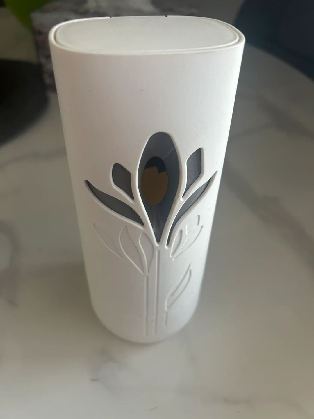 White Air Wick Freshmatic automatic air freshener dispenser. It has a floral cut-out design. This unit dispenses a burst of fragrance periodically. Great for keeping your home smelling fresh!