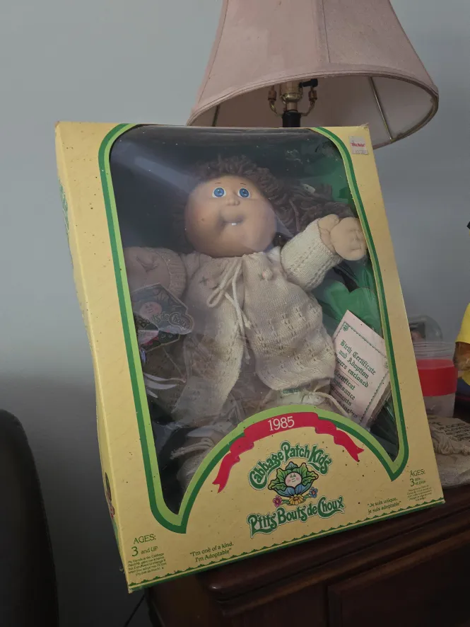 This is a vintage Cabbage Patch Kids doll from 1985, still in its original box. It includes a birth certificate and adoption papers. The doll is recommended for ages 3 and up.
