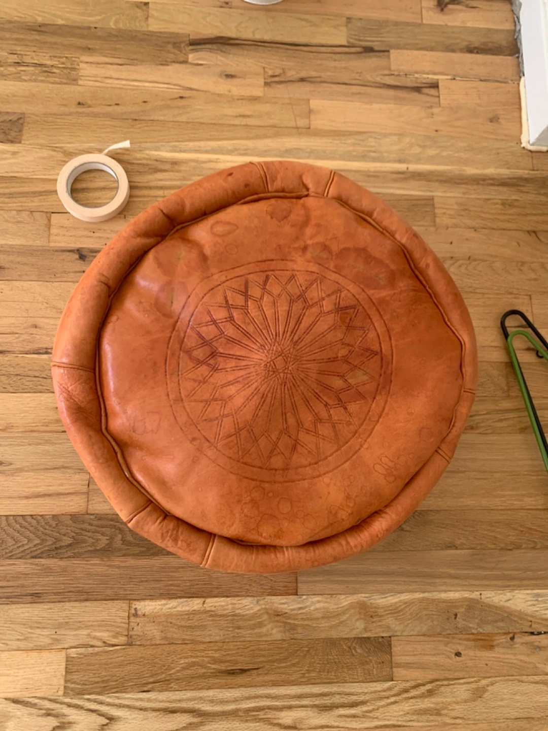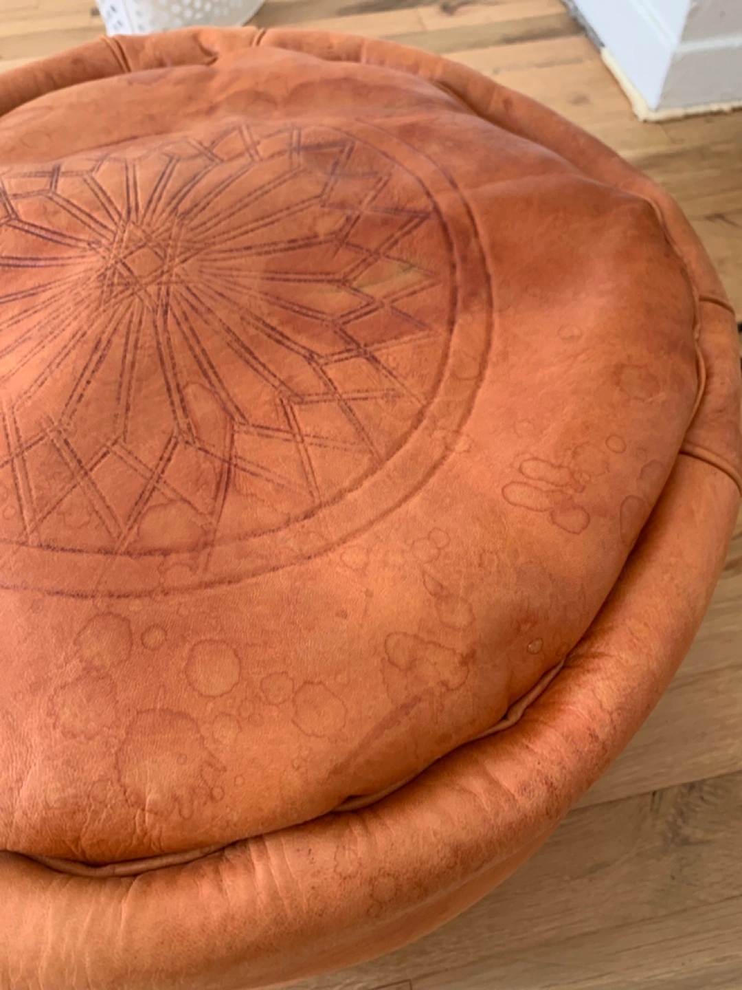 Free!! A leather Moroccan pouf ottoman! It has a beautiful, intricate design on top. There are some signs of wear, as you can see in the photos, but it's still in good condition and would look great in any living space. These should be fixable for someone who is willing to condition the leather! The leather is soft and super comfy.