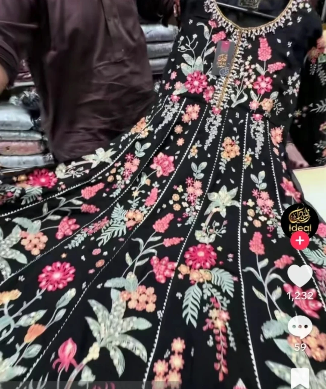 Beautiful black Anarkali dress featuring vibrant floral embroidery all over. It comes with a contrasting pink dupatta with a scalloped edge. The dress has long sleeves with embroidered cuffs and a detailed neckline. Perfect for special occasions!