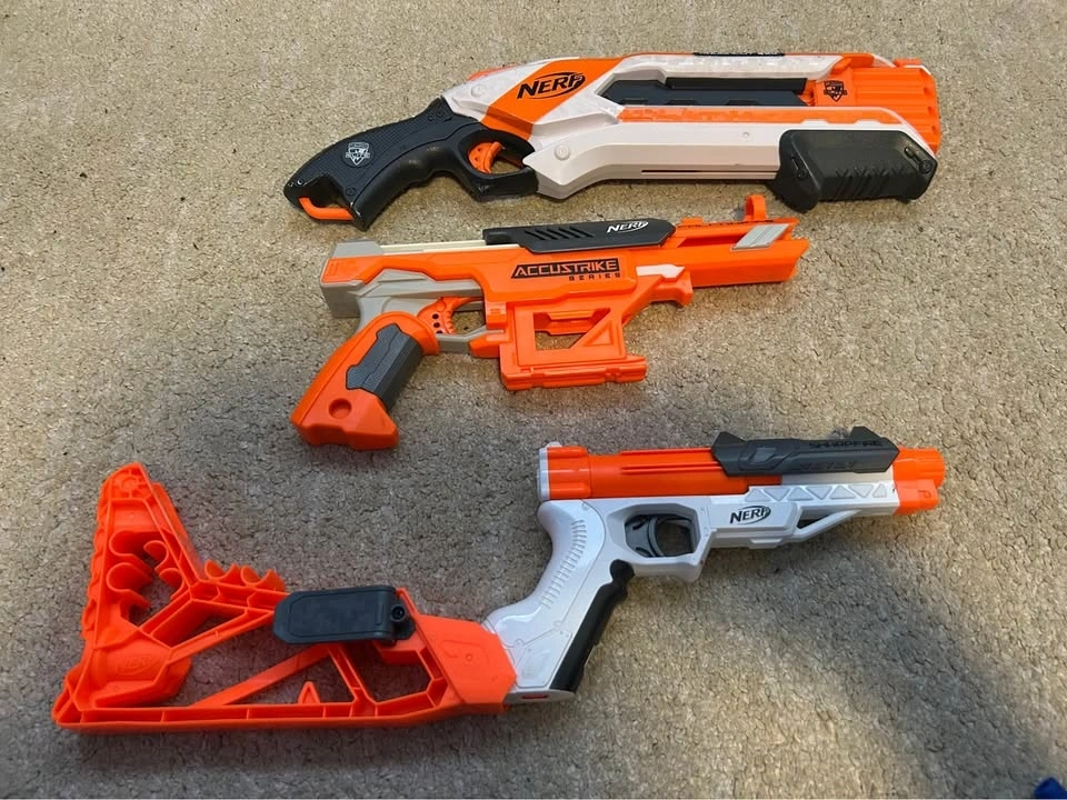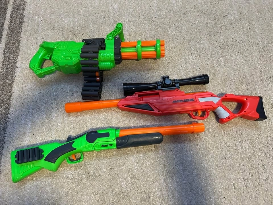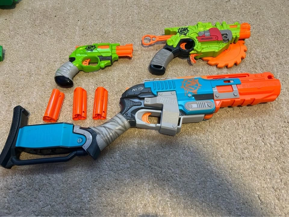 Large lot of Nerf guns, prefer to sell as a lot. Includes 3 Action Force brand and 11 Nerf brand guns. Some require specific darts, and only a few are included for those. Comes with all guns shown, plus a bag of random darts for the others. All guns are working. Pick up and cash only in the 25th and 9th line area.