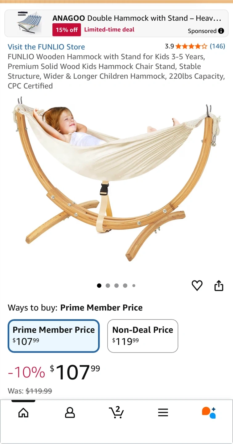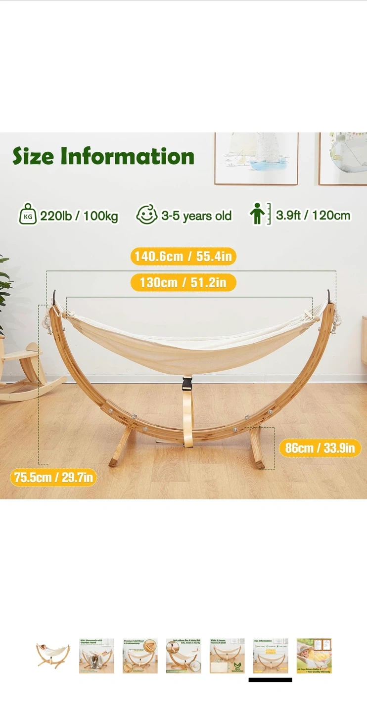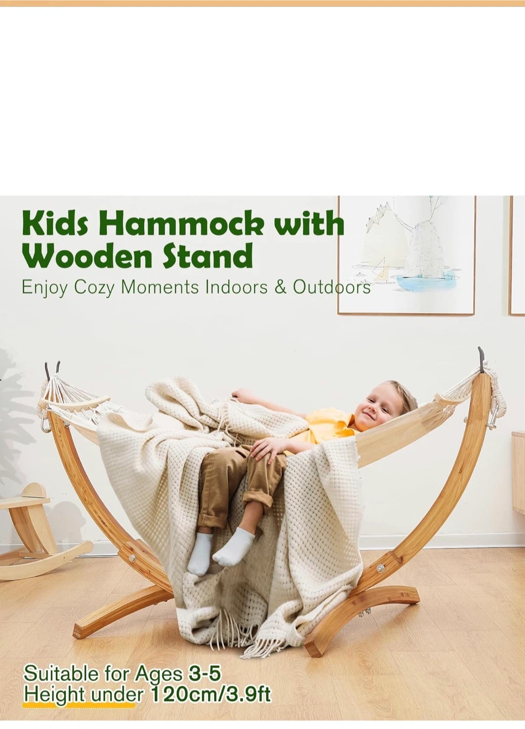 This FUNLIO double hammock comes with a sturdy wooden stand. It's suitable for kids aged 3-5 years old and has a weight capacity of 220lbs. The hammock measures 140.6cm long. It's perfect for creating a cozy spot indoors or outdoors!