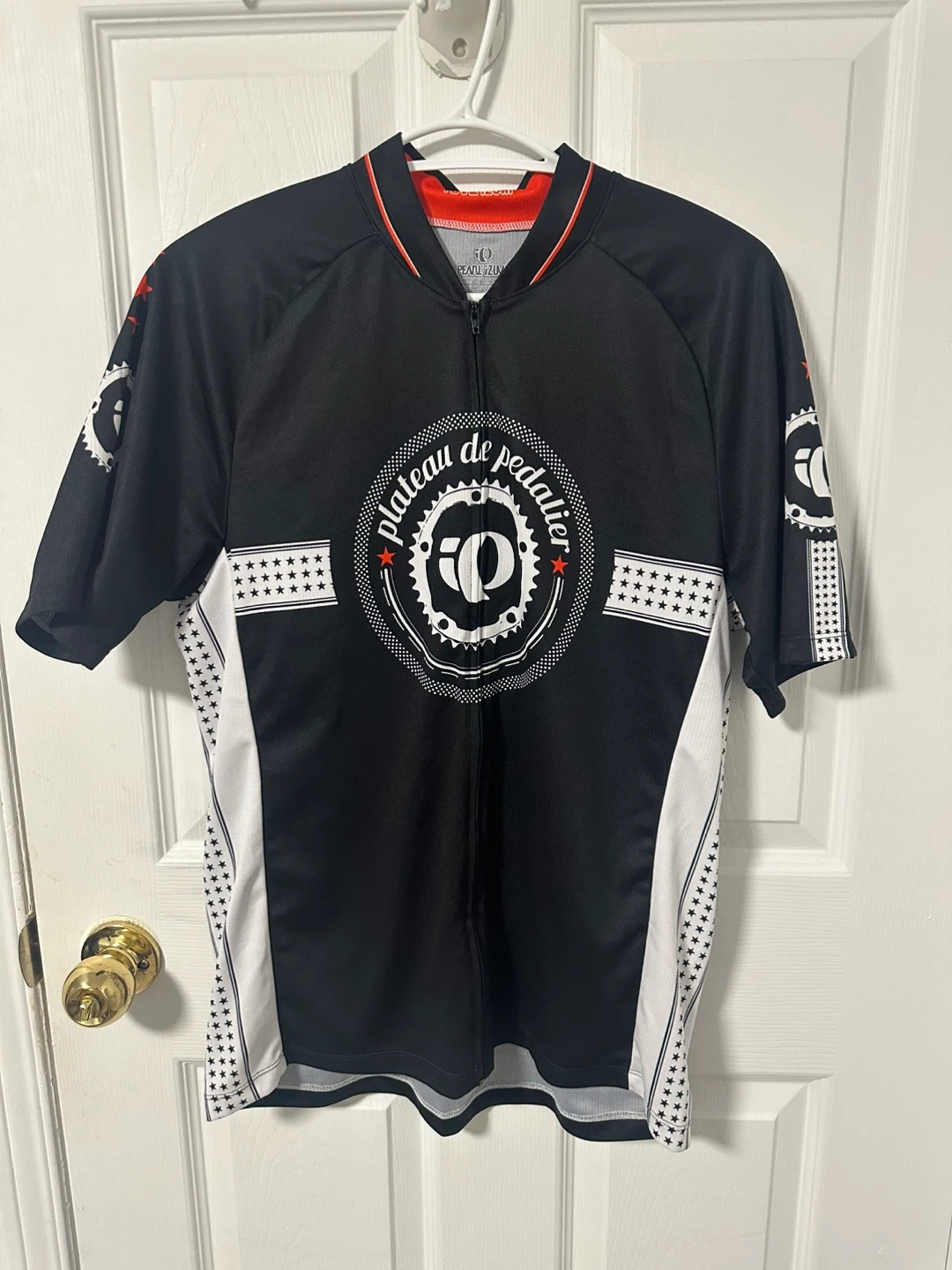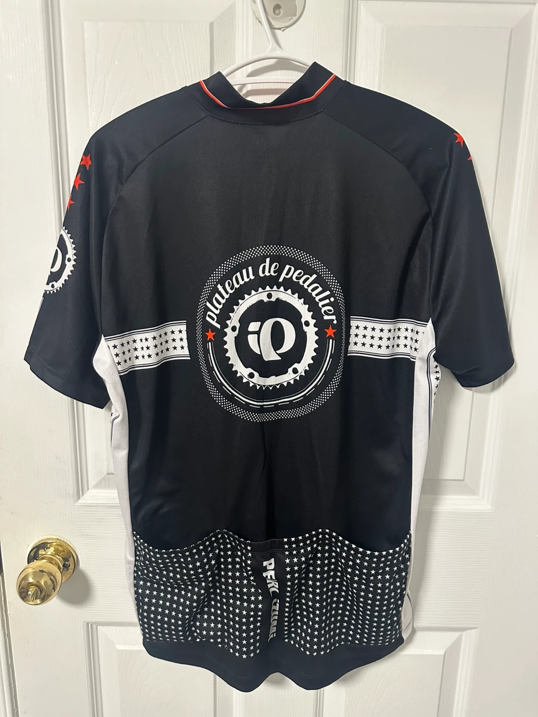 Pearl Izumi cycling jersey. It's a size medium. Features a full-zip front and a "plateau de pedalier" design on the back. Great for cycling enthusiasts!