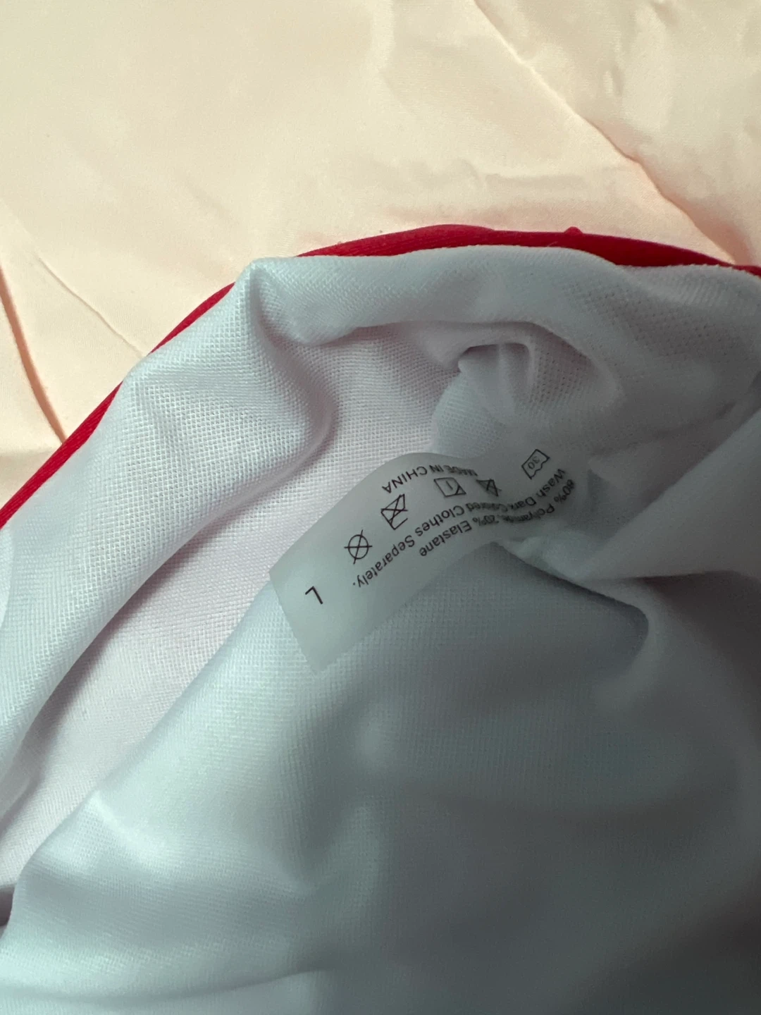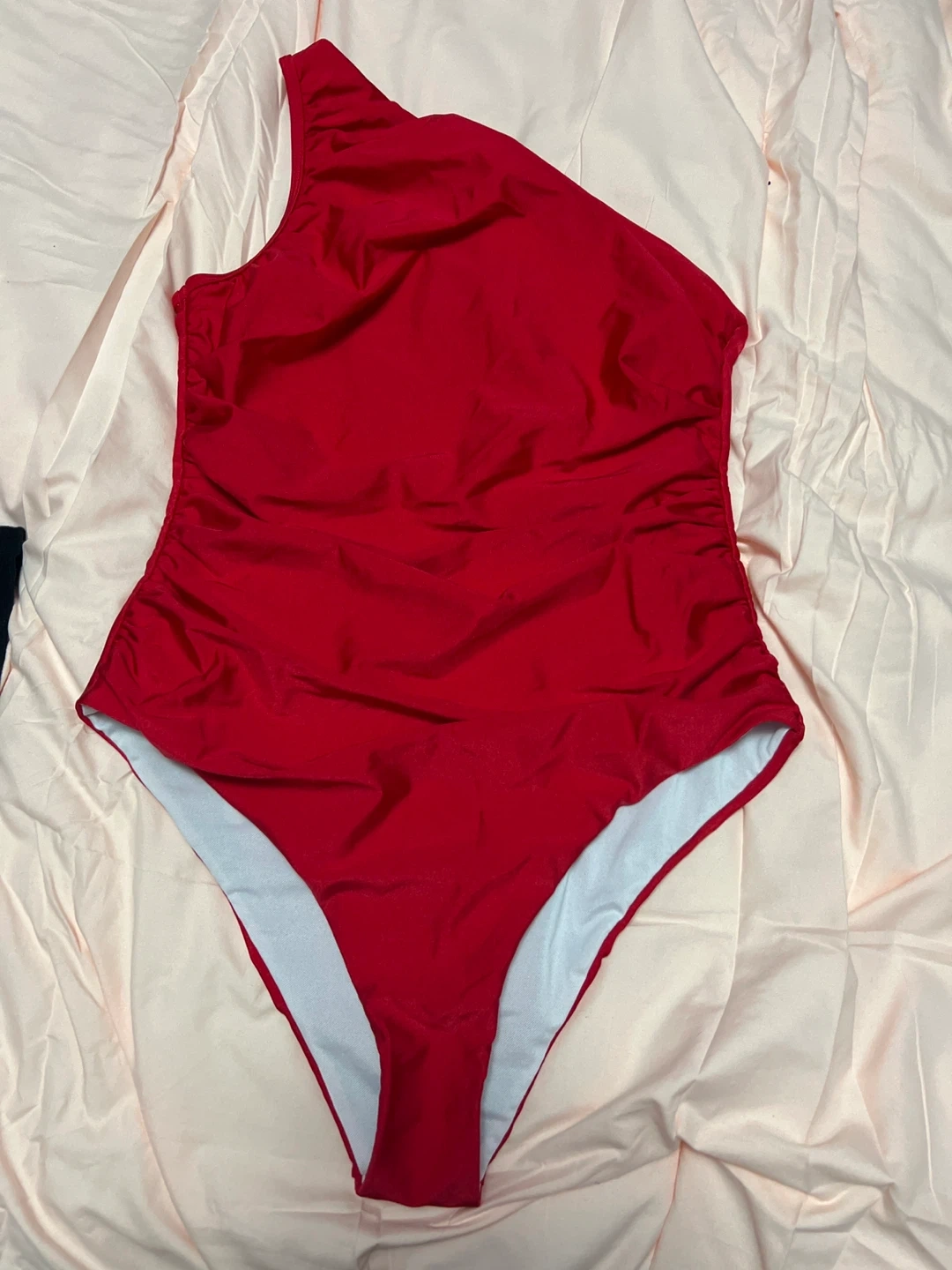 This red one-shoulder swimsuit is a size large. It's made of 60% polyester and 40% elastane. Wash this swimsuit separately from other clothes.