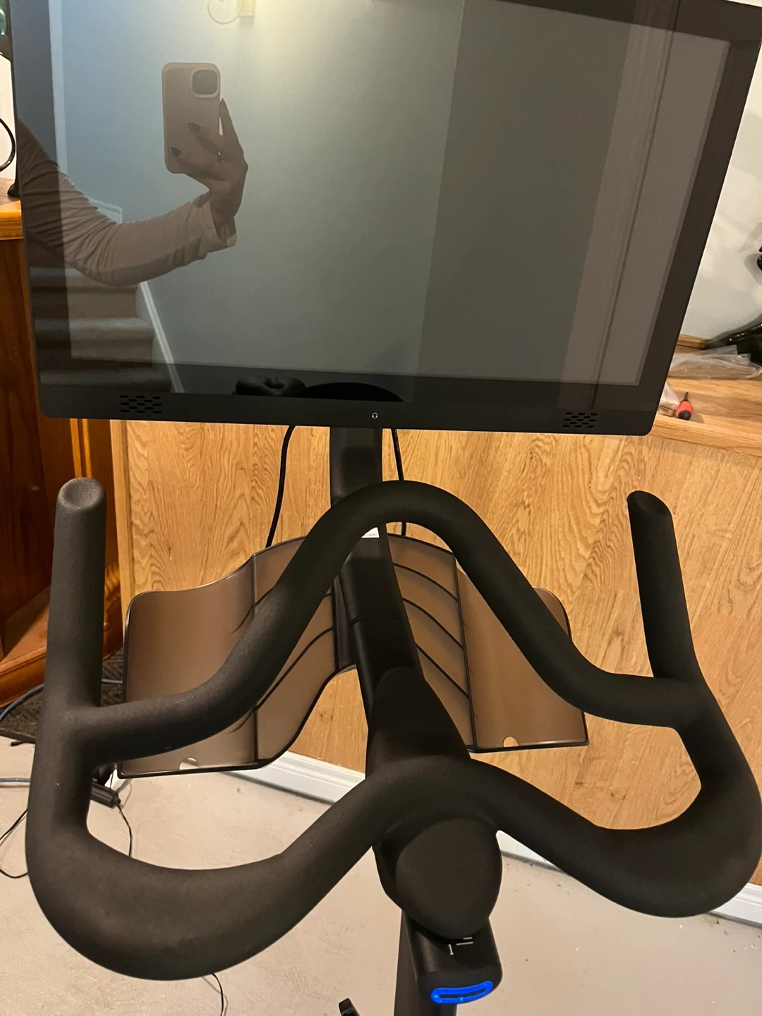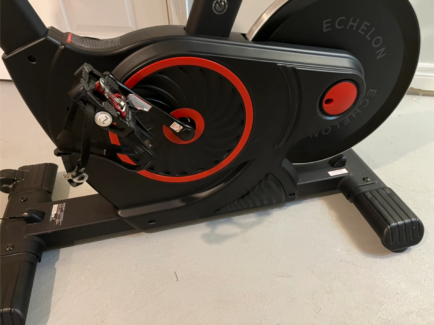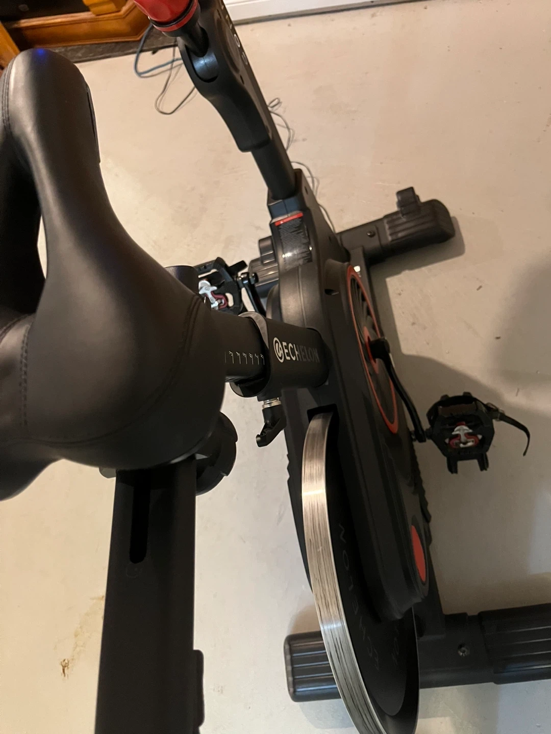 Echelon Connect indoor cycling bike with a built-in screen. This bike is black and has adjustable seat and handlebars. It's great for at-home workouts! Also comes with an additional pair of brand new pedals. Extra bolts and wrenched also included. Basically brand new.