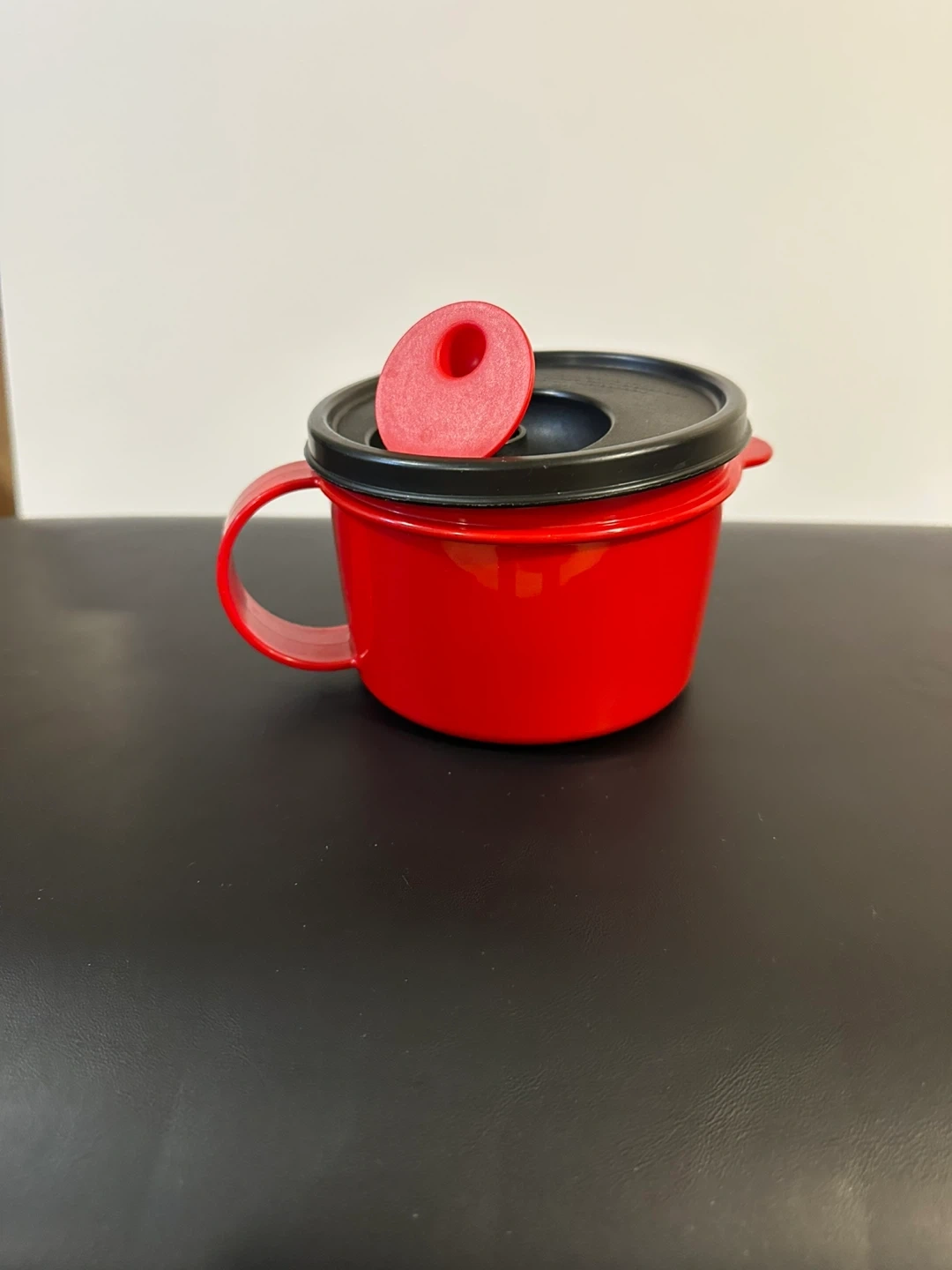 Selling a red Tupperware microwave soup mug! It's in great shape and ready for your next cozy soup night. Perfect for heating up leftovers or making a quick lunch. The lid is included, making it easy to transport your soup without spills