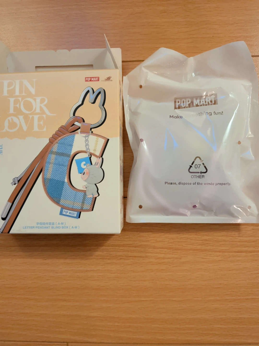 This is a POP MART Pin for Love Series Letter Pendant Blind Box. It's a collectible item, with each piece having a unique design.