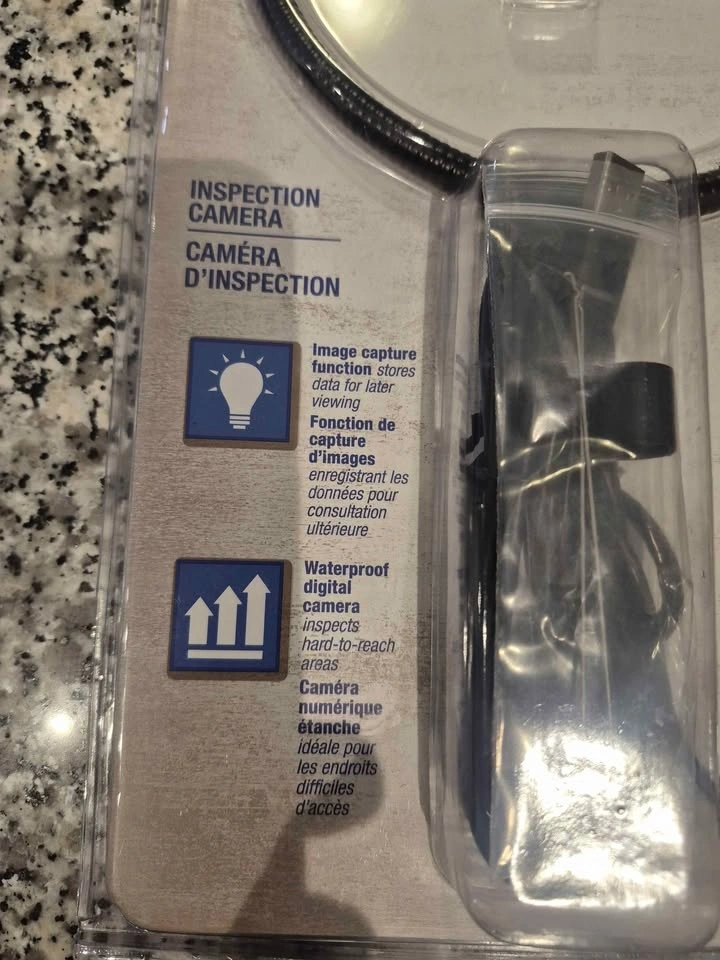 This is a Mastercraft Basic Inspection Camera. Ideal for examining hard-to-reach areas in automotive, plumbing, and construction tasks. Features a waterproof camera head and flexible cable for navigating damp spaces. Includes a USB computer interface to capture images and transfer them to a computer for review. Equipped with 4 adjustable LED lights for brightness control. **NEVER USED** Located near the south end GO station.