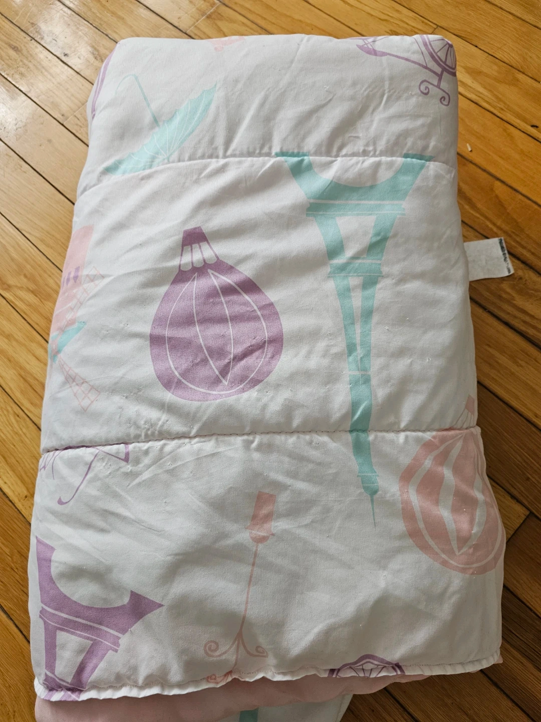 This kids comforter for twin bed features a charming pink Eiffel Tower and hot air balloon design. It's perfect for sleepovers or camping trips. Made with a soft lining for comfort.
