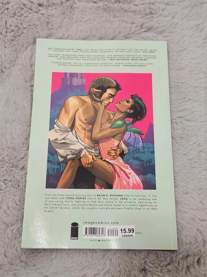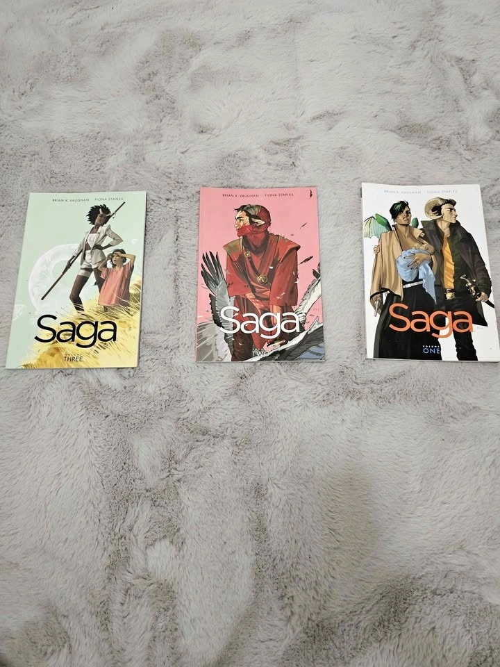 Saga by Brian K. Vaughan & Fiona Staples. Paperback graphic novels from the award-winning series. All books are in good condition - clean pages, light shelf wear (see photos). Available as a set or individually. $30 CAD for all 3 books or $12 CAD each. Pickup in Coquitlam. Cash only.